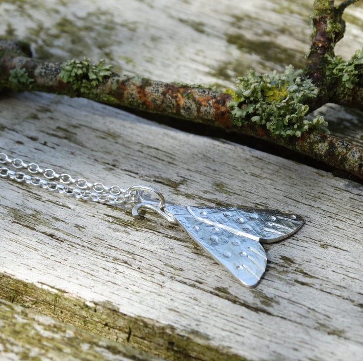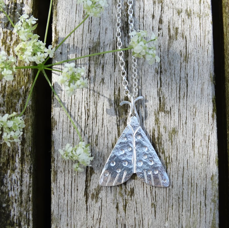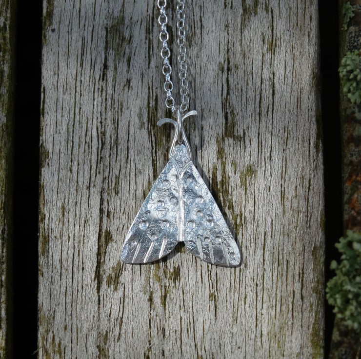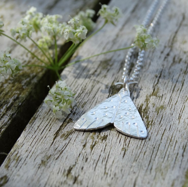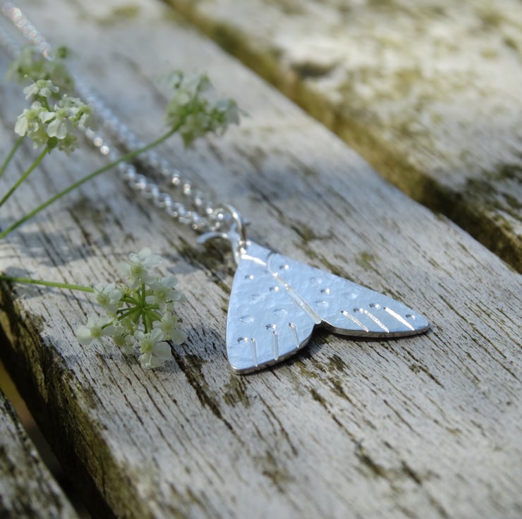 Each of my moths is drawn by hand before being cut out from Eco Silver sheet using a jeweller's saw. The silver has been given a mottled texture with a hammer to represent the markings on a moth's wings, and the surface has been patterned with punches. Little antennae made from Eco Silver wire have been soldered on.