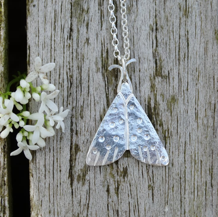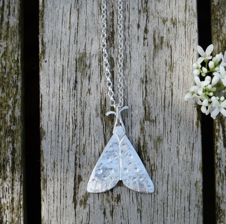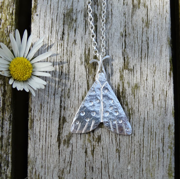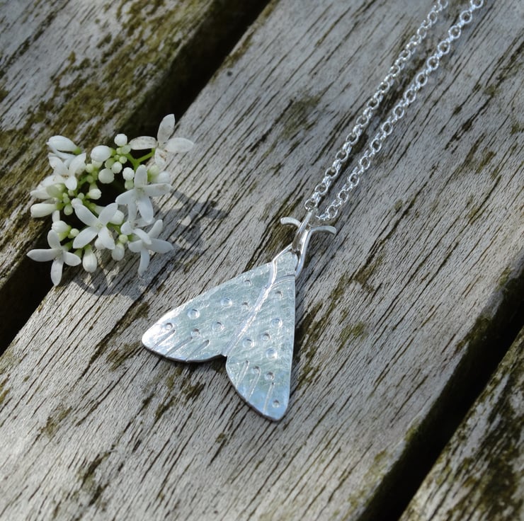 This little moth pendant is inspired by the Scarlet Tiger Moths that appear in our garden each summer, at around the time of the summer solstice. Scarlet Tiger Moths are daytime flying moths and I associate them with long summer days.