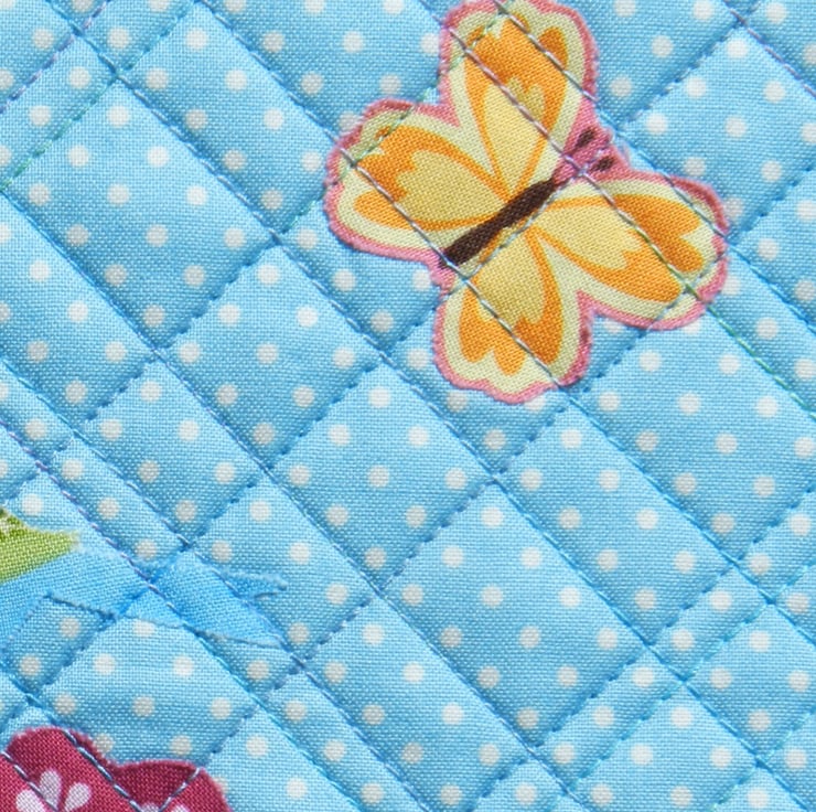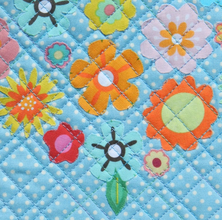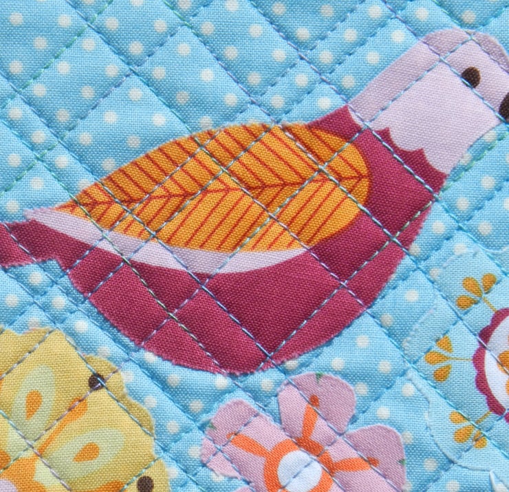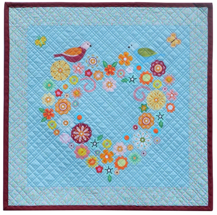 Once I'd fused lots of coloured flowers in a heart design onto the polka-dot background, I topped each side of the heart with a bird and butterfly motif. I then added a border in a pretty little flower-print fabric which picks up the colours in the garland.