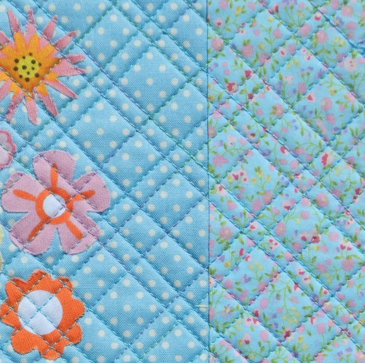 Next, I quilted by machine across the whole design in straight lines to create a random checkerboard effect, using a variegated thread in pastel colours. The quilt is backed in pale green, and the edge is bound in a maroon, embellished with a wavy decorative stitch.