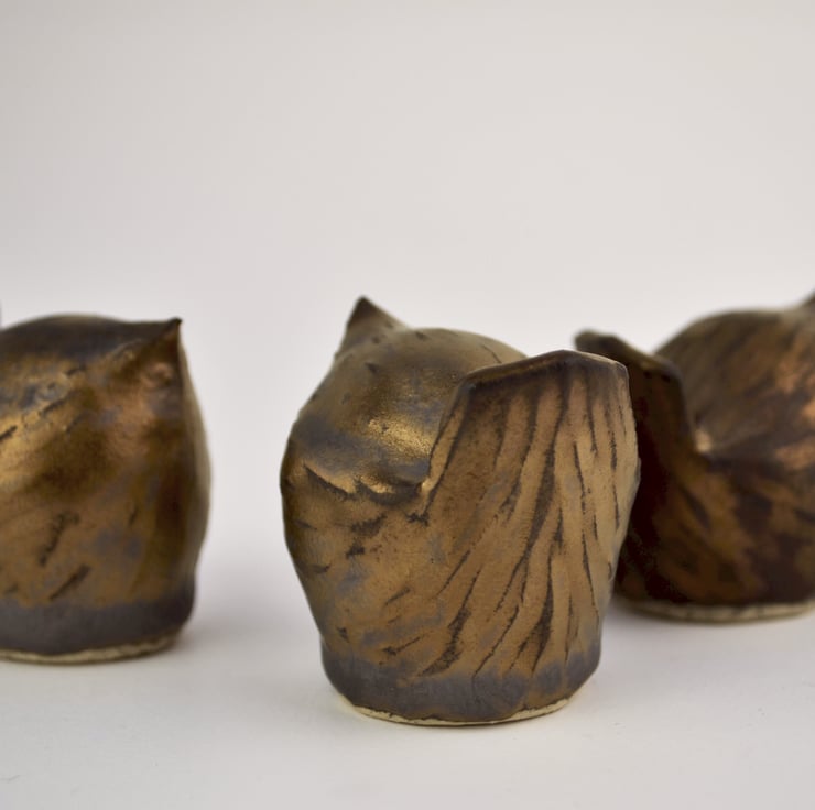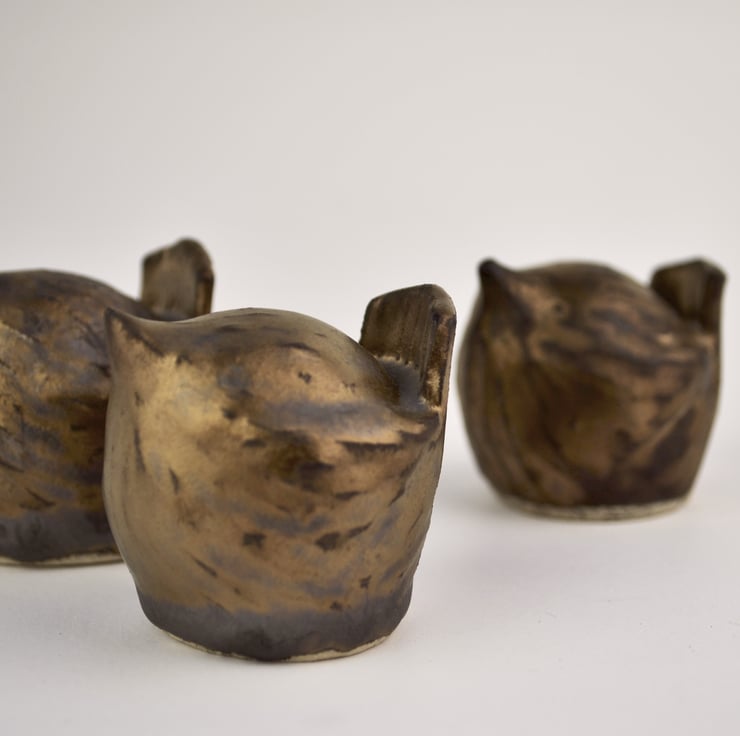 Each one is hand-built and fired to stoneware temperatures, the surfaces carved to add to the reflecting surface, leaving less metallic peaks as a contrast and it also gives a feather like appearance. Perky tail and beaks added later to add to the wren characteristics I am aiming for.