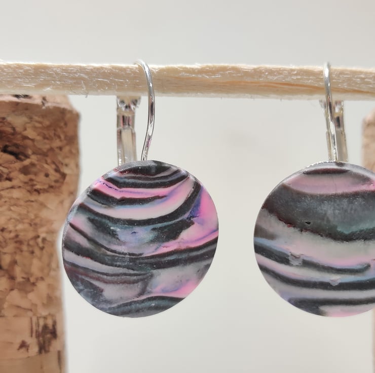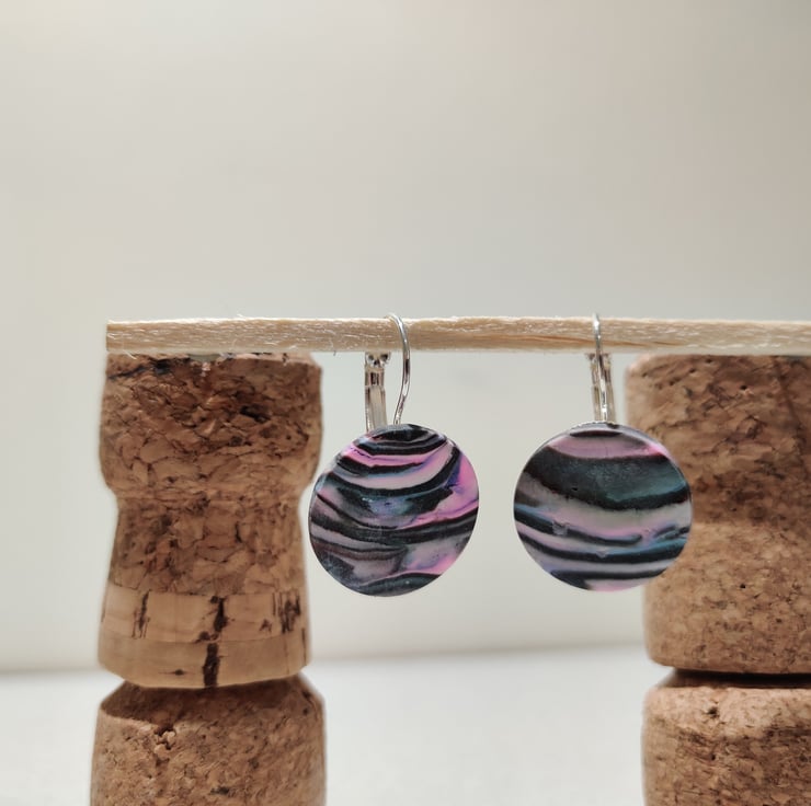 Hand made polymer clay earrings with a bright abstract patten and metallic sheen. Hook fixing which can be painted with hypo allergenic coating for free on request. Please see all photos for close up detail. All products handmade therefore there may be minor imperfections. Each pair sold as seen, message for more info
