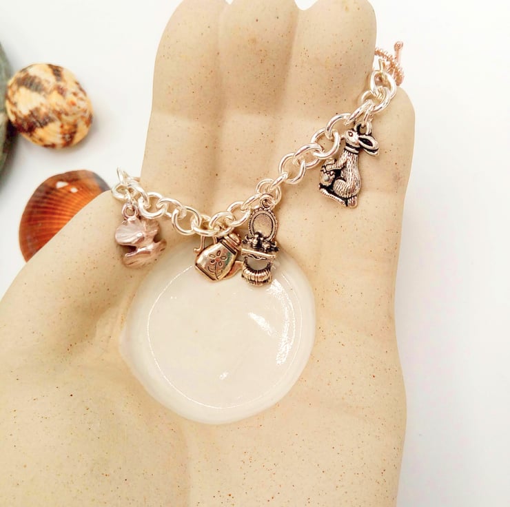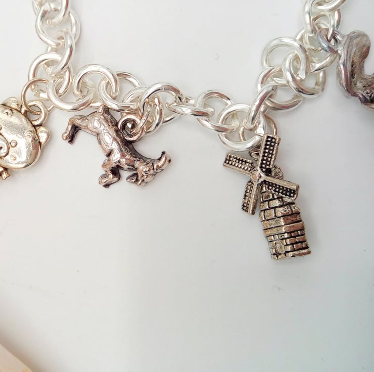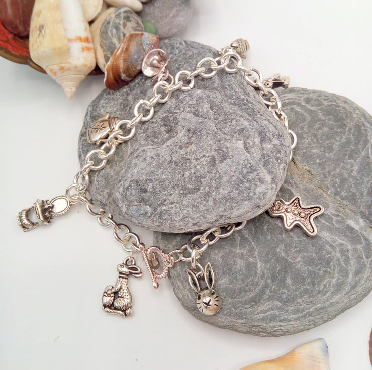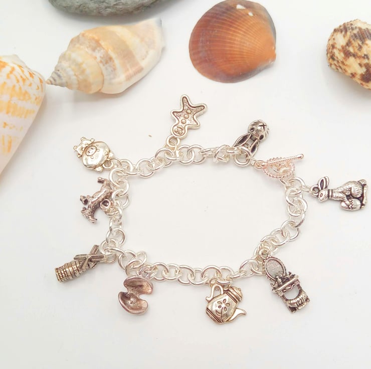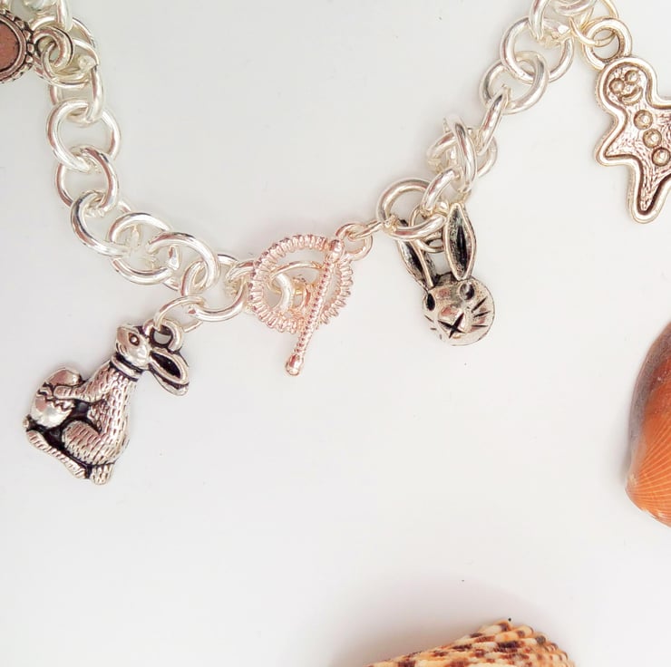 This very pretty charm bracelet or anklet, called "Fairy Tales" will add a fun touch to any casual, beach or everyday outfit you choose to wear. It would also make a lovely gift for someone special, or a treat for yourself. The bracelet or anklet is made using the following silver plated charms: Rabbit's Head, Gingerbread Man, Piggy, Goat, Windmill, Clam Shell with Pearl, Coffee Pot, Dressing Table, Rabbit, all hung on a silver plated chain. The Bracelet is 7.5 inches (19 cm) in circumference and has a silver plated toggle clasp. The bracelet will be dispatched wrapped in tissue paper in an organza bag, and delivered to you via Royal Mail first class post.
