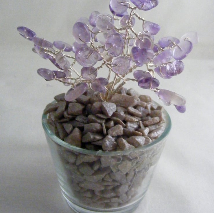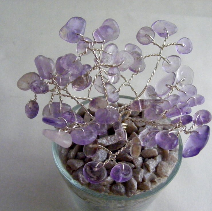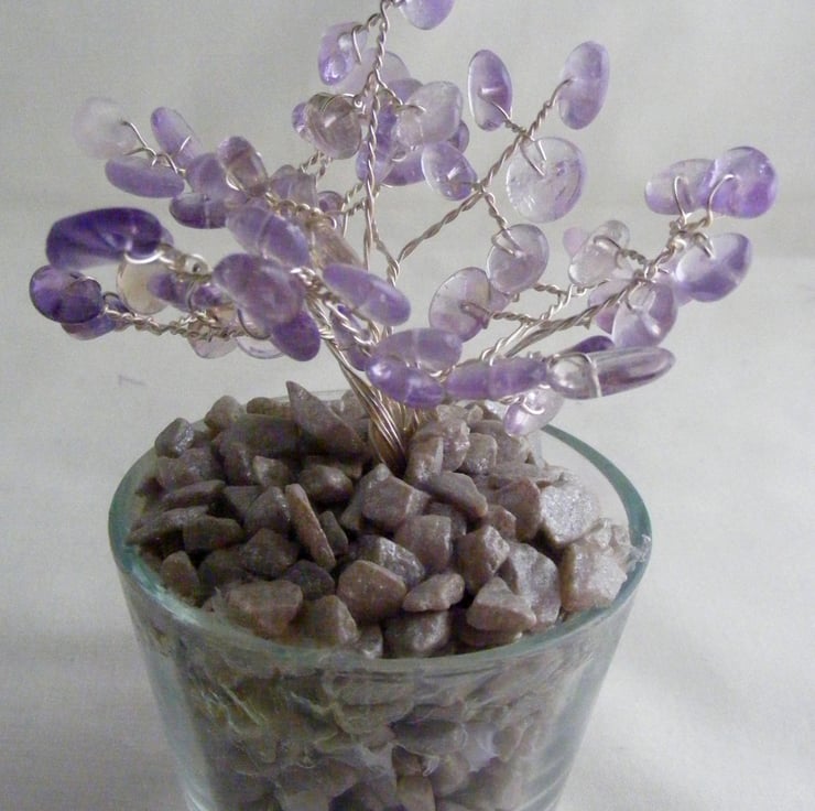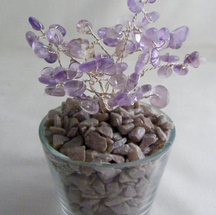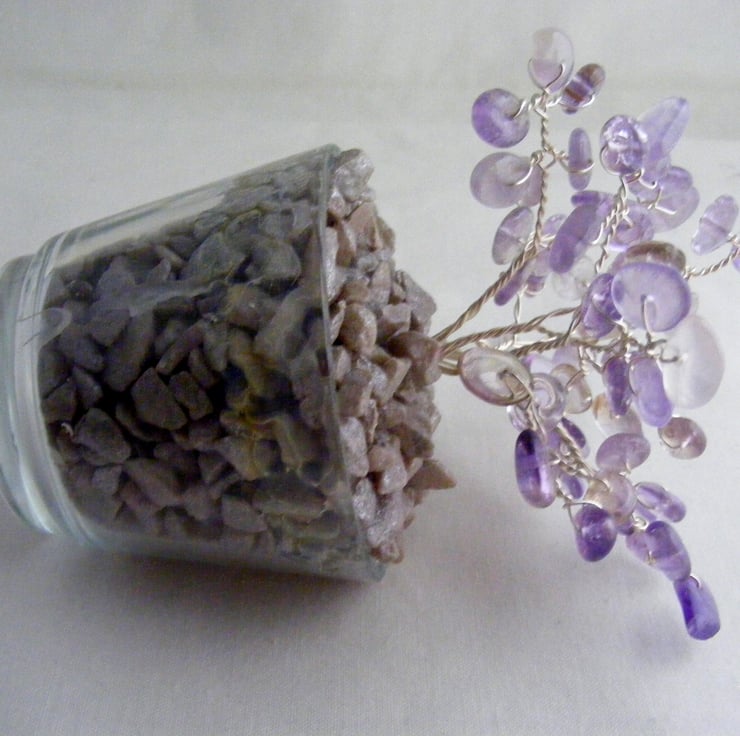 This is the last of my gemstone tree collection for now. Will be making more trees. I've handmade this beautiful gemstone tree using, ametrine smooth gemstone nuggets, silver plated wire, 7.5 x 6 cm round glass holder, pearlised pebbles and glue.