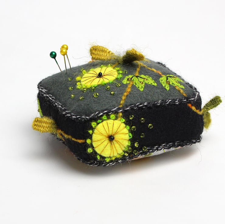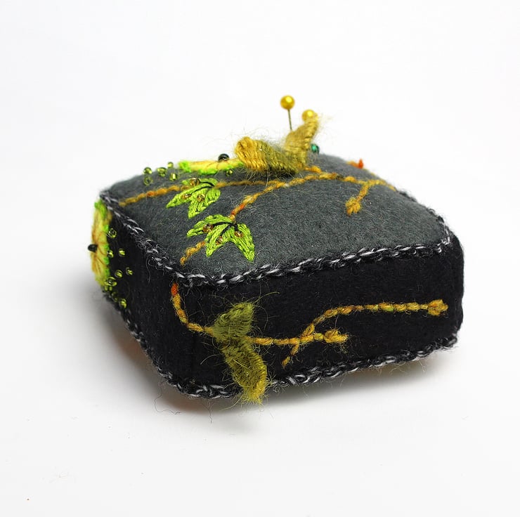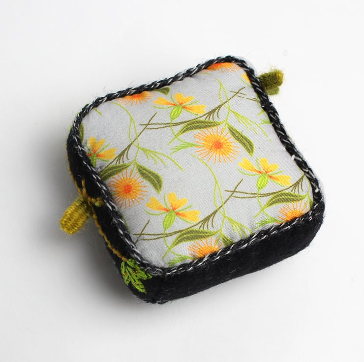 Handmade half cube shaped pincushion with charcoal colour felt on top and black felt sides. The pin cushion is hand embroidered with Almond Blossom embroidery design on four sides and on the top in greens and yellow colours. The bottom is made from my Marigold print on cotton. The half cube measures 7.5cms(3ins) in width and 2.5cms(1inch) in depth. A crochet trim has been added to the seams in black and white yarn. The pincushion comes with some pins.