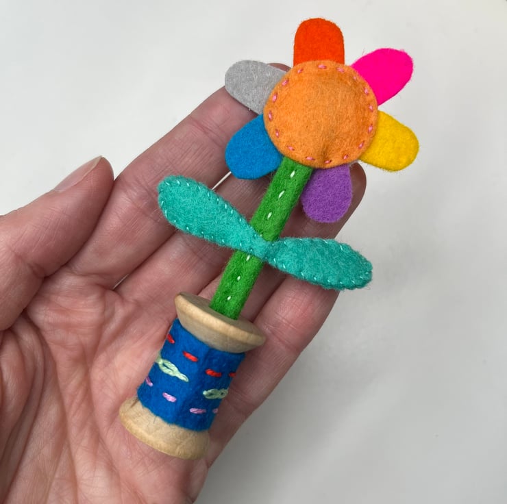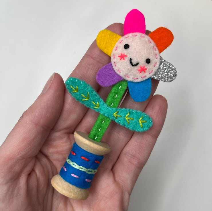 Each one is completely made by hand: the felt is all cut by hand, then embroidered and hand stitched into place. The flowers are then fixed into a small wooden bobbin with a dab of glue. The flower stalks are made from wire covered in wool felt, and hand stitched into place. A small amount of toy stuffing gives the flower’s smiling face shape. A shiny metallic sticker on the underneath covers the flower stalk. The wooden bobbin has a hand embroidered cover.