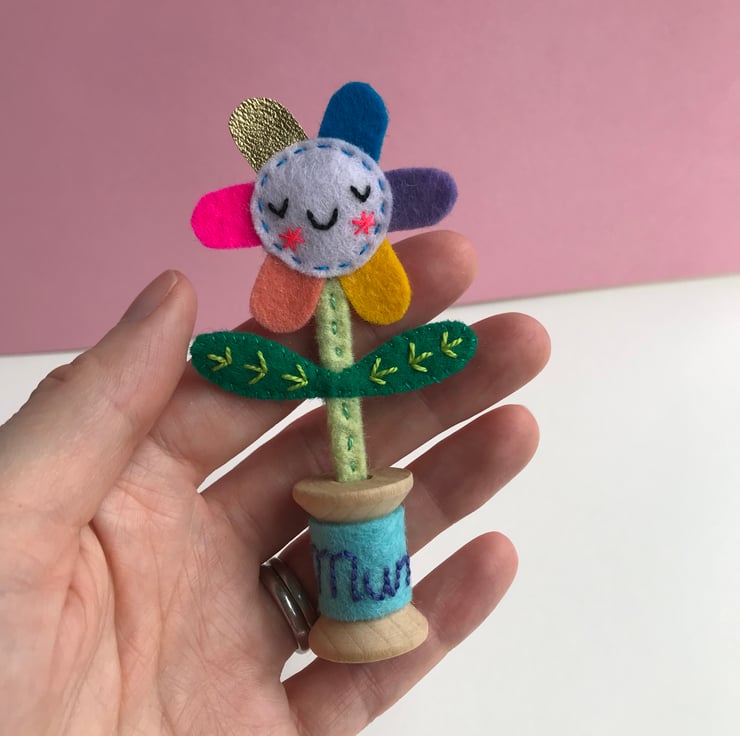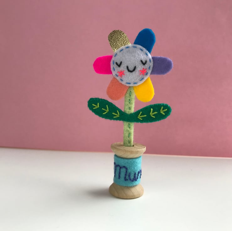Each one is completely made by hand: the felt is all cut by hand, then embroidered and hand stitched into place. The flowers are then fixed into a small wooden bobbin with a dab of glue. The flower stalks are made from wire covered in wool felt, and hand stitched into place. A small amount of toy stuffing gives the flower’s smiling face shape. A shiny metallic sticker on the underneath covers the flower stalk. The wooden bobbin has a hand embroidered cover.