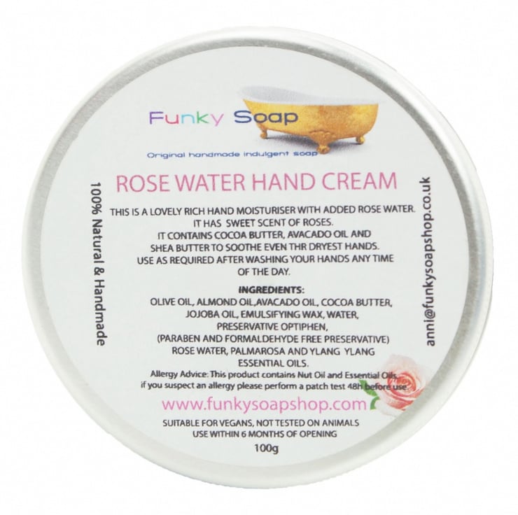 This is a beautiful rich hand moisturiser with rose water. It contains avocado oil, shea and cocoa butter to lock in the moisture of even the driest hands. It has a clean fresh rose scent and is easily absorbed and will make your hands feel soft and nourished all day. Only essential oils are used for fragrance. Apply as required to your hands after washing, non- greasy. This product contains a very small amount of the approved preservative optiphen. Optiphen is a formaldehyde and paraben free preservative. Without this the product would not be usable for more than 3 weeks.