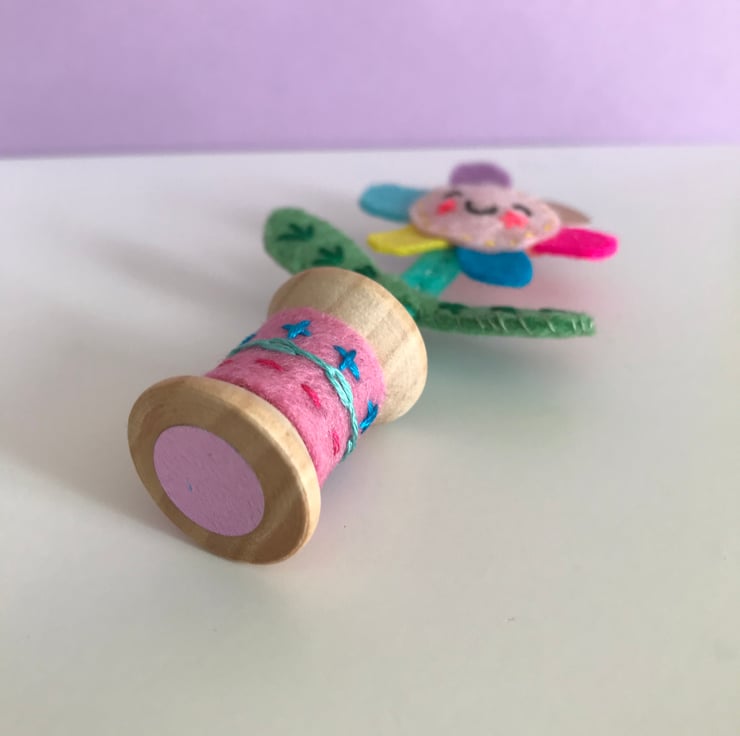 Each one is completely made by hand: the felt is all cut by hand, then embroidered and hand stitched into place. The flowers are then fixed into a small wooden bobbin with a dab of glue. The flower stalks are made from wire covered in wool felt, and hand stitched into place. A small amount of toy stuffing gives the flower’s smiling face shape. A shiny metallic sticker on the underneath covers the flower stalk. The wooden bobbin has a hand embroidered cover.