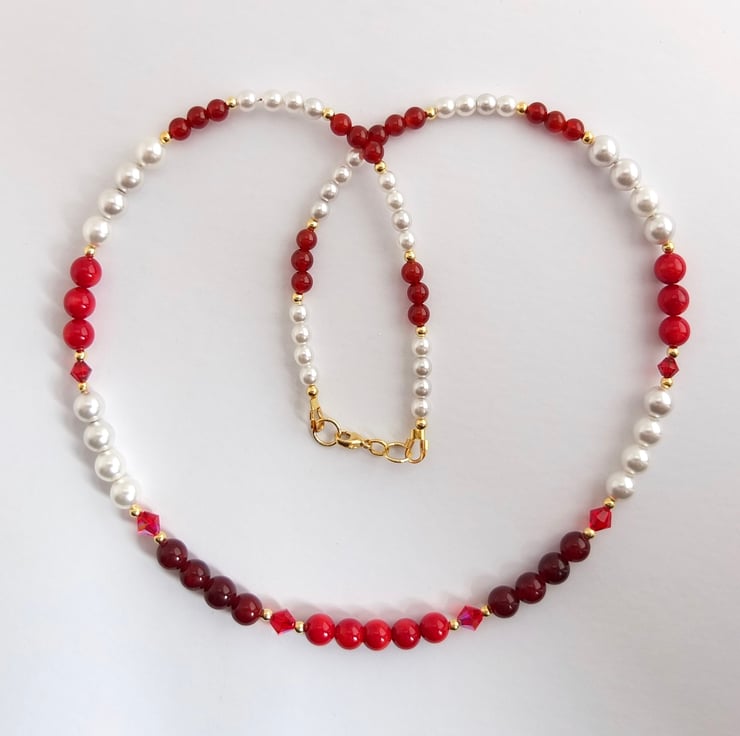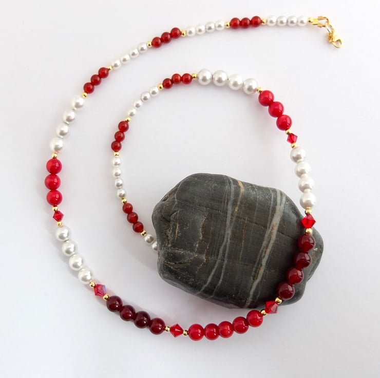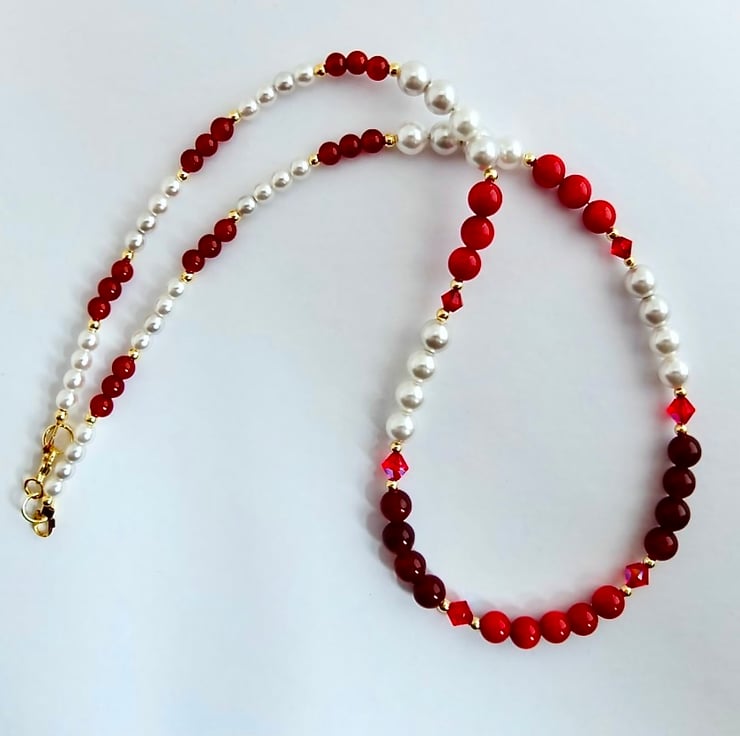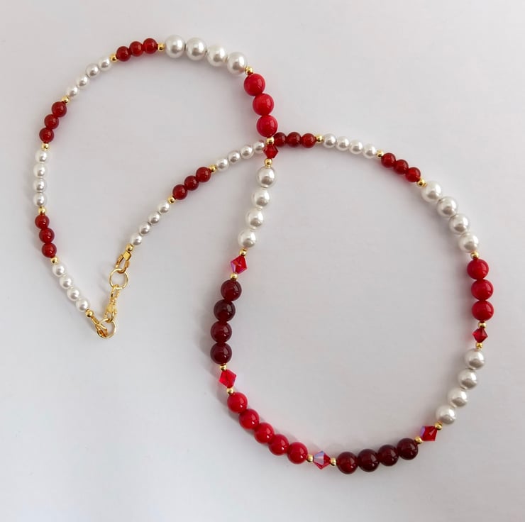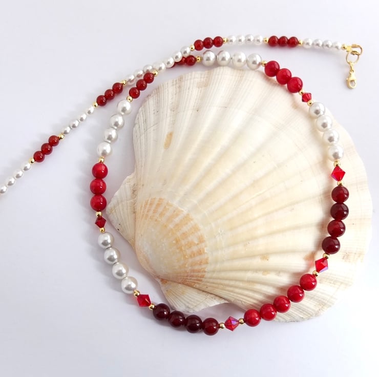Red bamboo coral, red agate and white Czech glass pearls graduate to smaller red carnelian and glass pearl, interspersed with 5mm and 4mm ruby-red premium crystal bicones, in the colours 'light siam' and 'scarlet', and tiny gold vermeil beads.