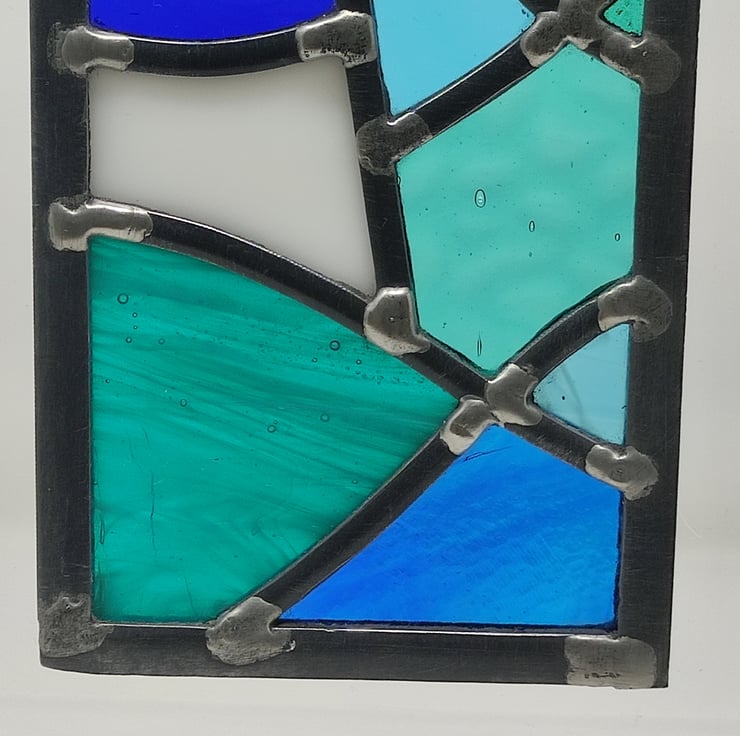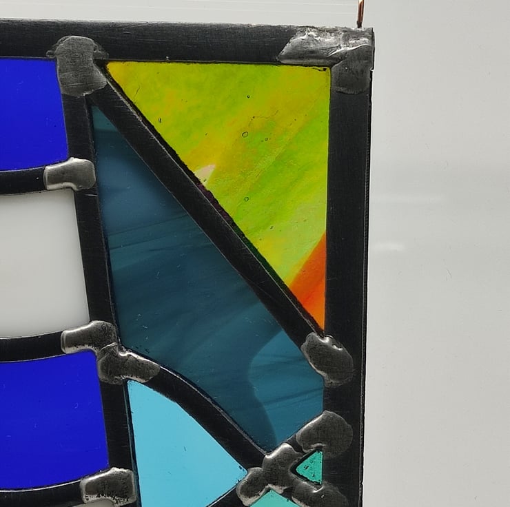 Once cut, the panel is then leaded, soldered and cemented. Hooks have been added for hanging this piece in your window.