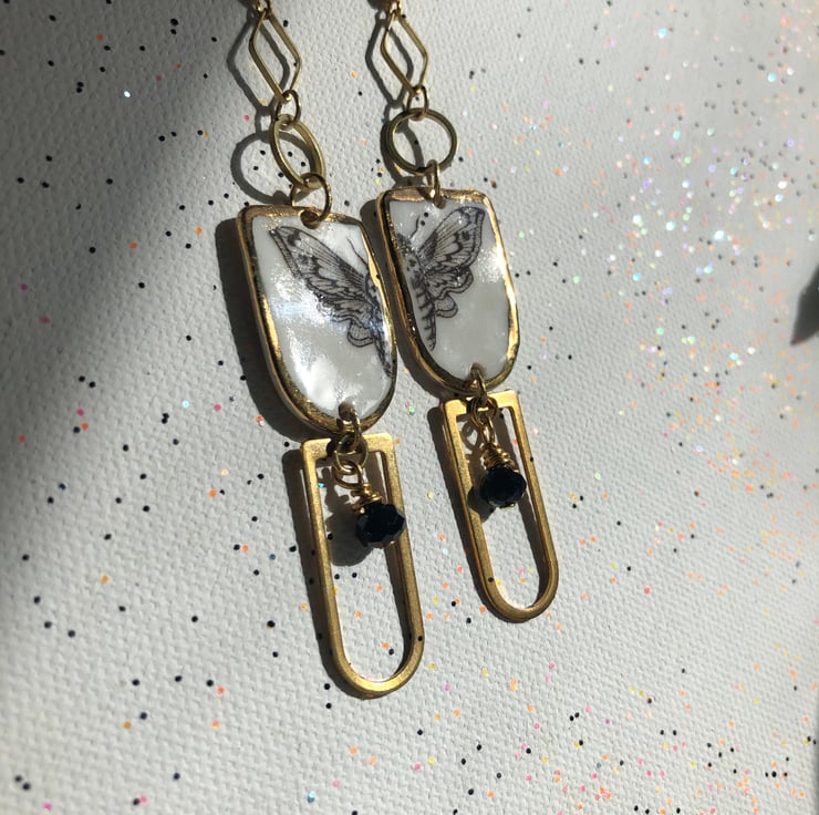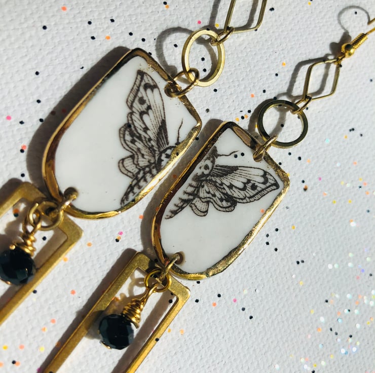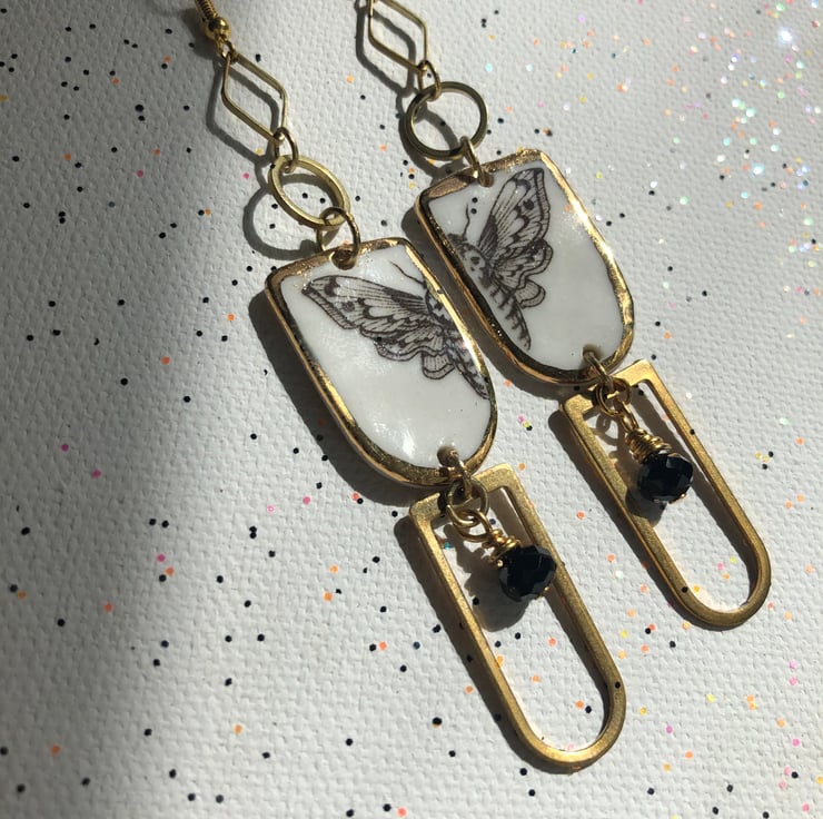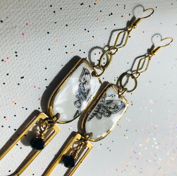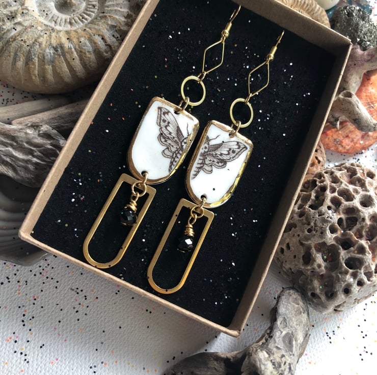Unique and sassy porcelain and brass handcrafted long drop earrings with a Death head moth design and real 22 ct gold lustre.