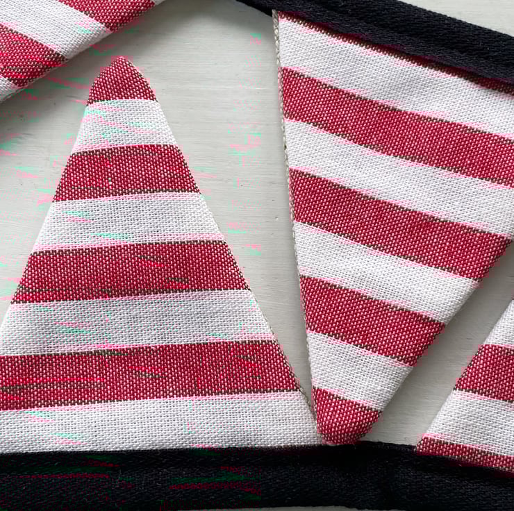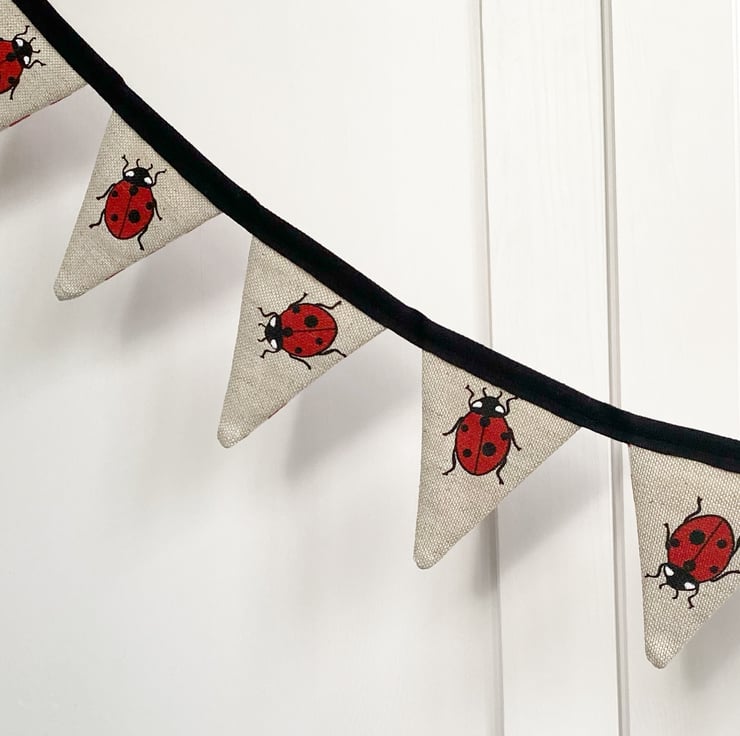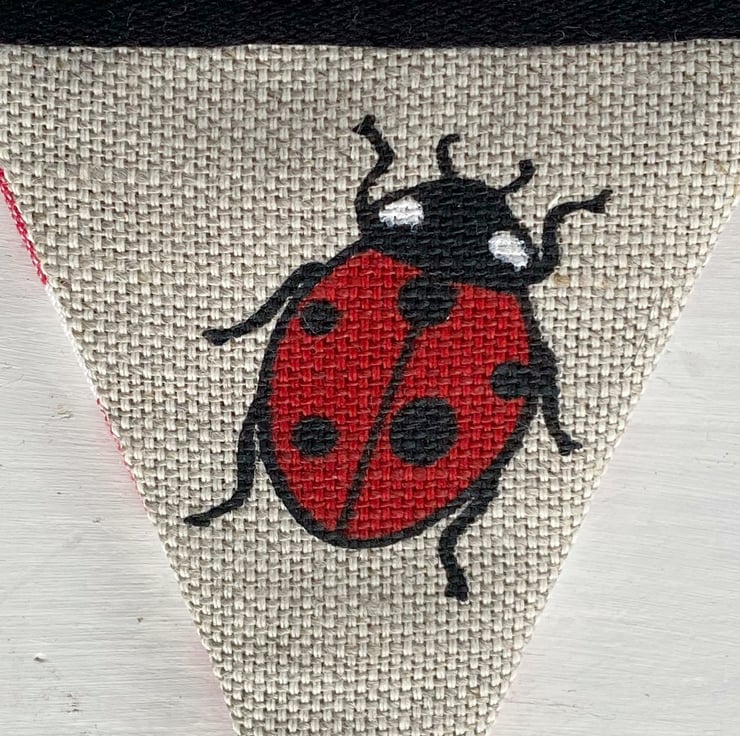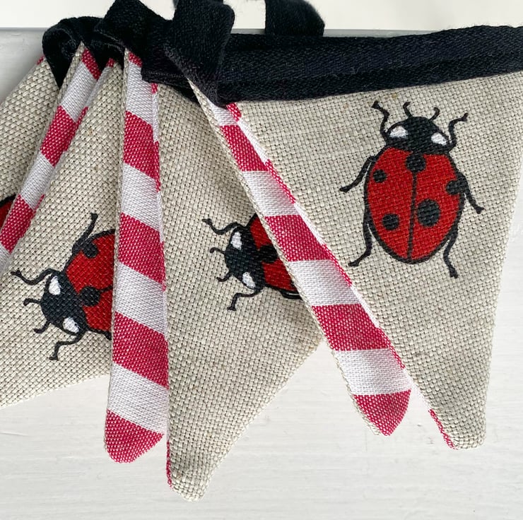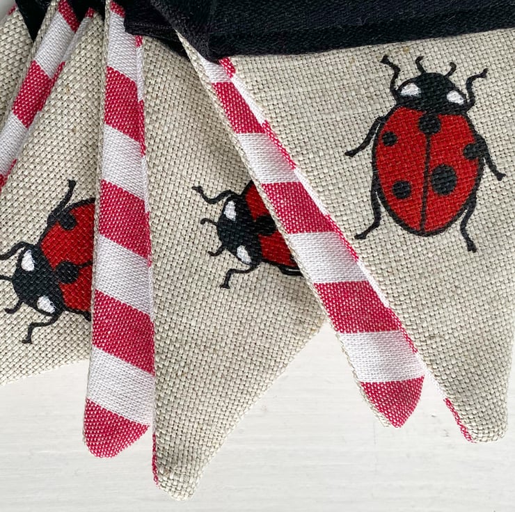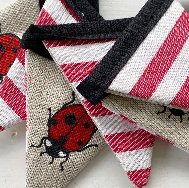 Seven double-sided flags featuring jolly red ladybirds on linen-look taupe cotton on the front and a red and white stripe woven cotton on the back, all securely sewn onto black cotton tape.