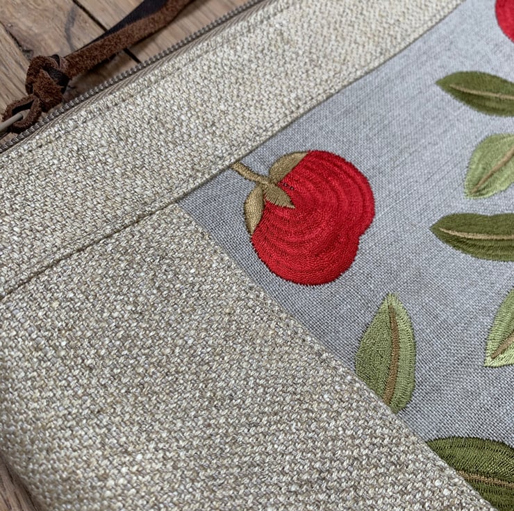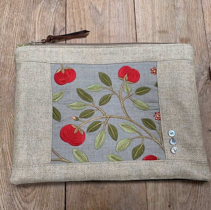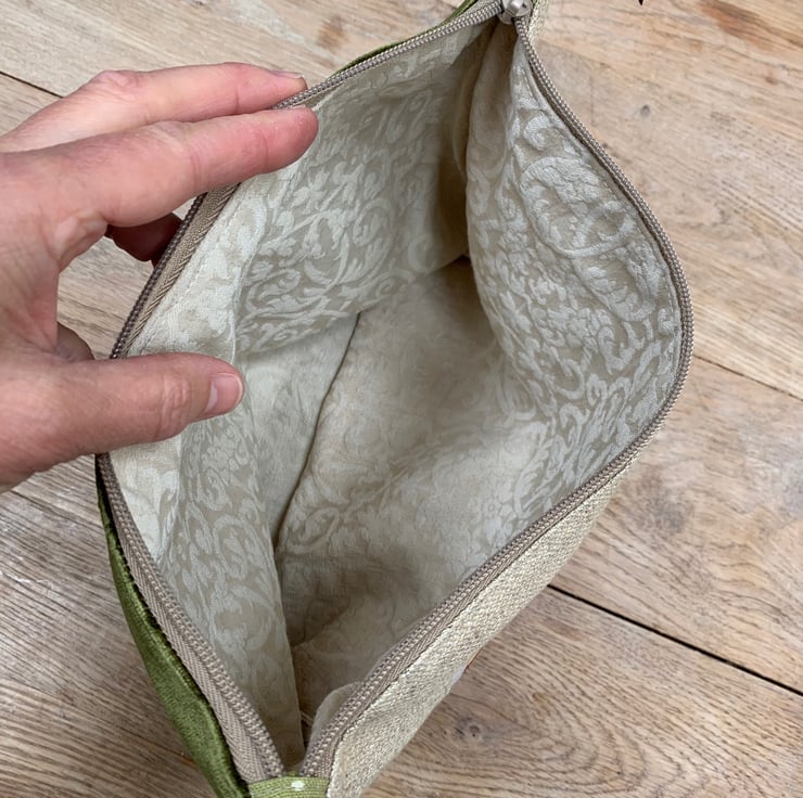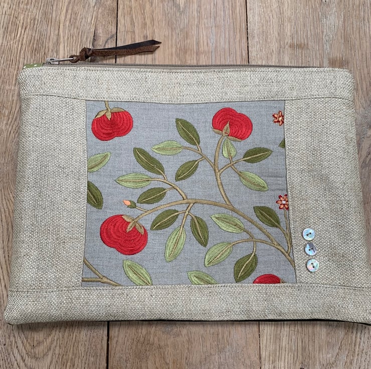 Zip pouch with a beautiful GP & J Baker Medlar embroidered linen panel framed in linen/viscose mix fabric and backed in designers guild velvet. The bag is fully lined with reclaimed damask.