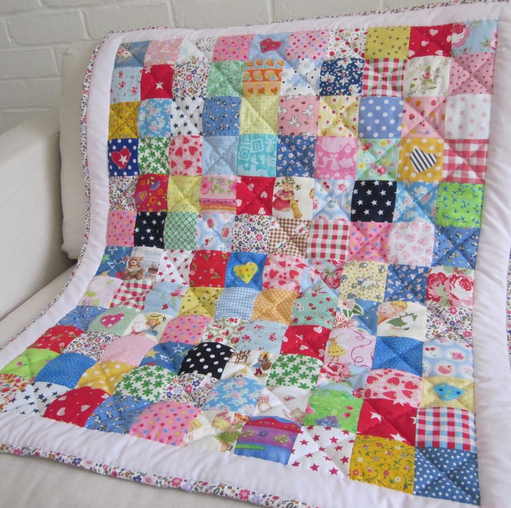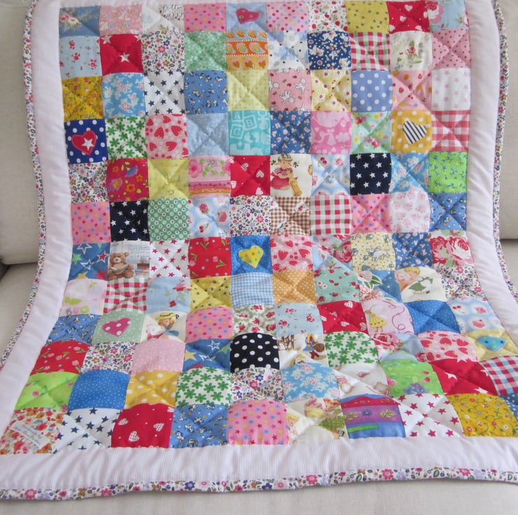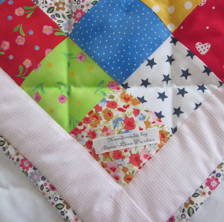 A pretty handmade patchwork Quilt/Play Mat - 29" x 34" (74cm x 87cm) made from 100% cotton Fabric - HAND QUILTED AND HAND FINISHED .