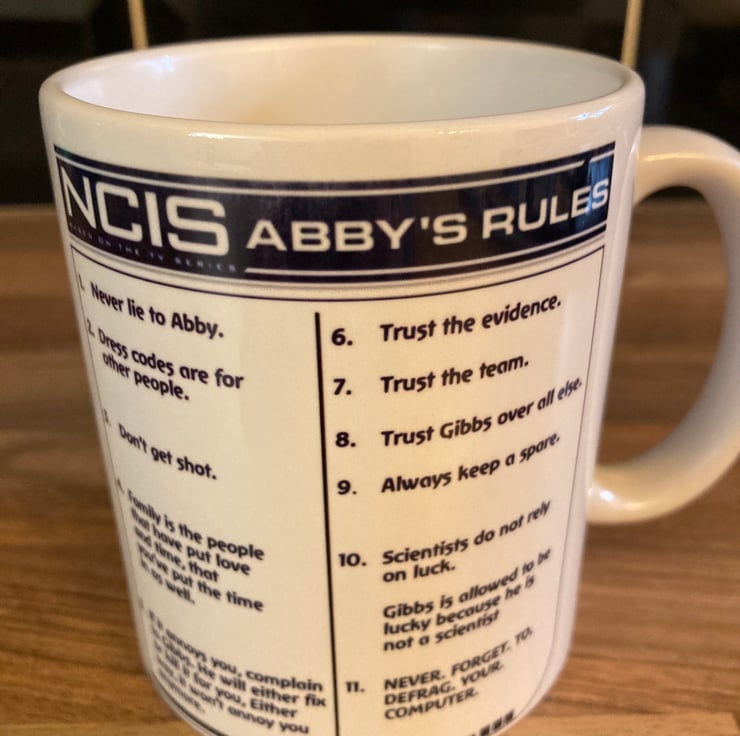This unique designed 11 Oz mug is featuring Abby Sciuto (Pauley Perrette) and her rules.