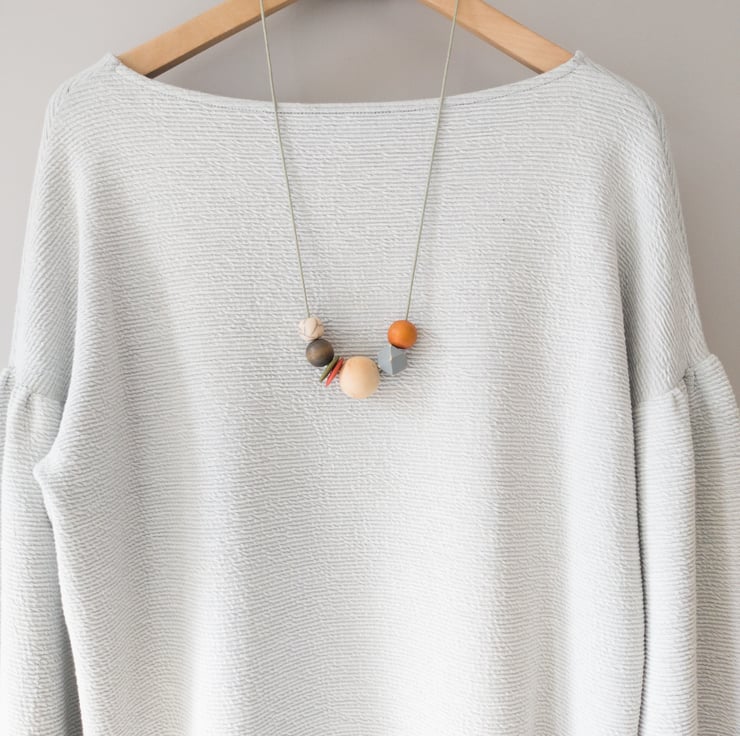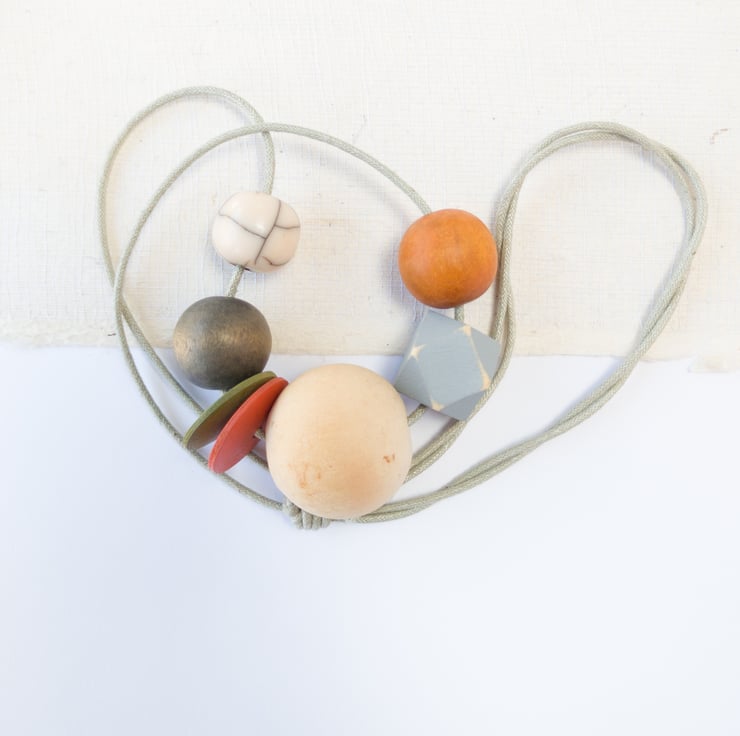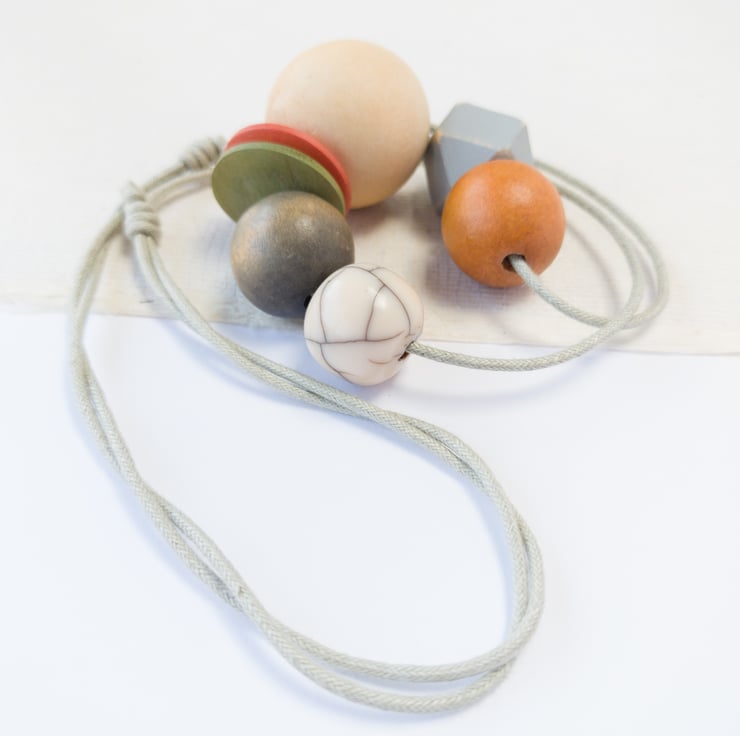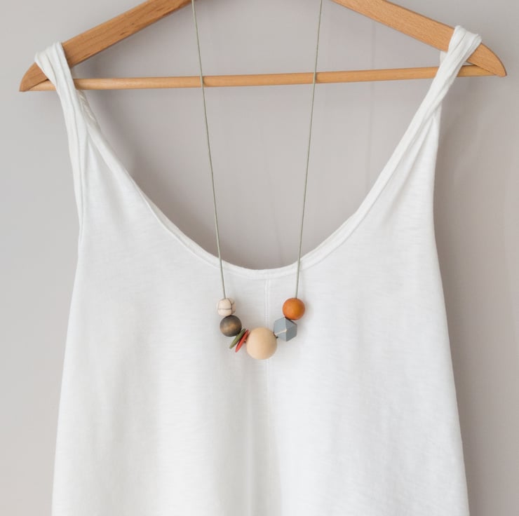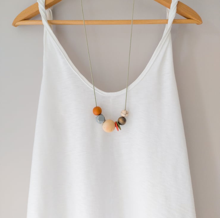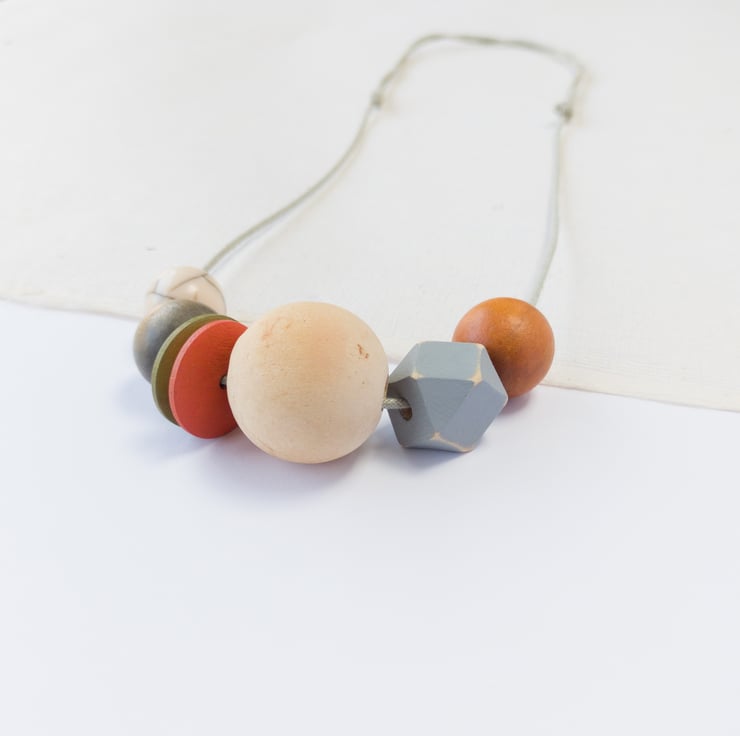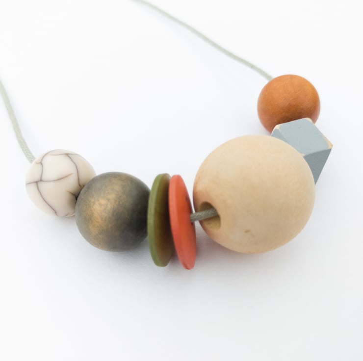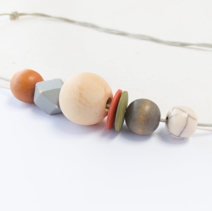 'Mila' is from the same series as one of my other necklaces called 'Isla'. This one is slightly more muted in colour; burnt orange, olive green, grey and natural. There is one small off-white crackle bead which gives a slight pattern to the necklace. I've also added two button beads and a grey painted distressed hexagonal bead to add a bit of fun! This is one of my smaller designs and can easily be adjusted to your required length using the sliding knots.