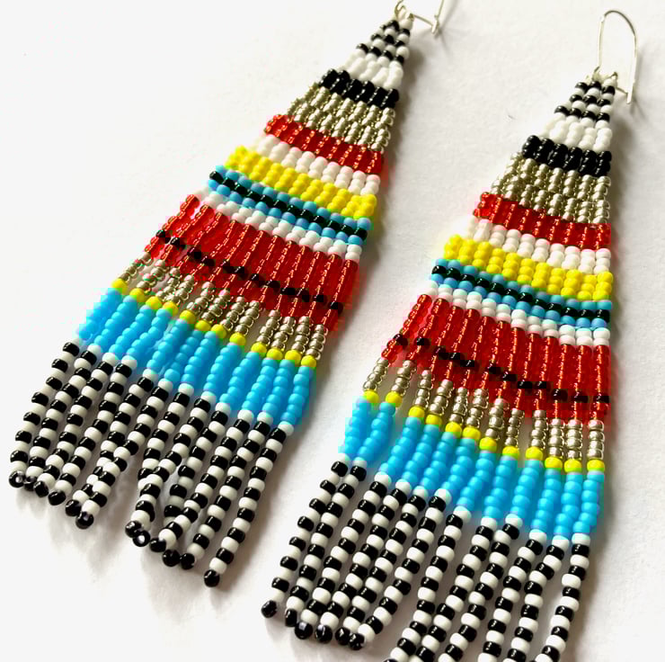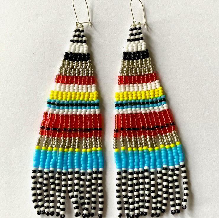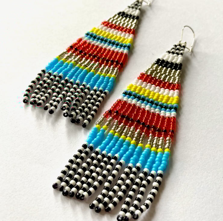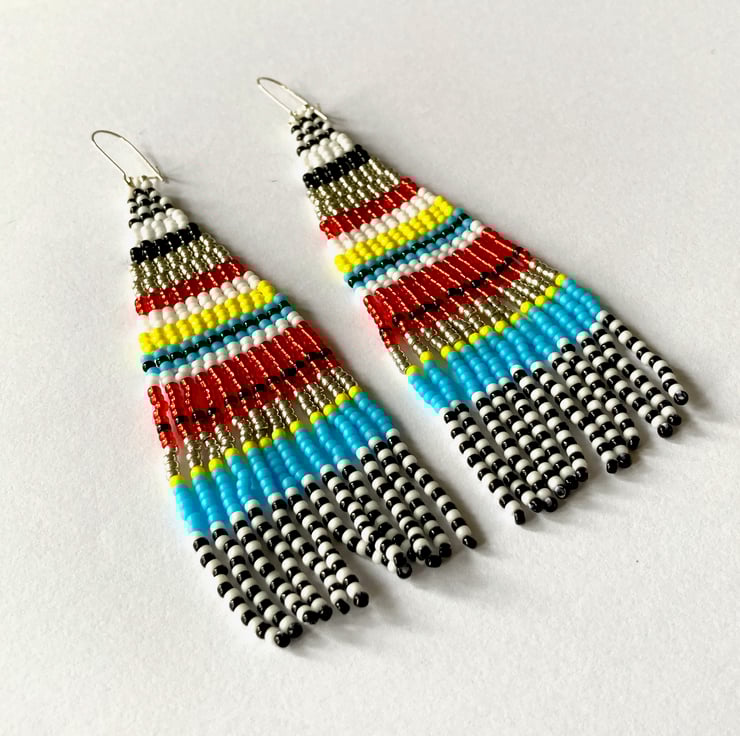 I can also usually custom make these in other colour combinations or lengths - please contact me to discuss. I also have a lovely pair in ice cream colours available here - https://folksy.com/items/7855219-Ice-Cream-Stripe-Long-Fringed-Beadwoven-Earrings