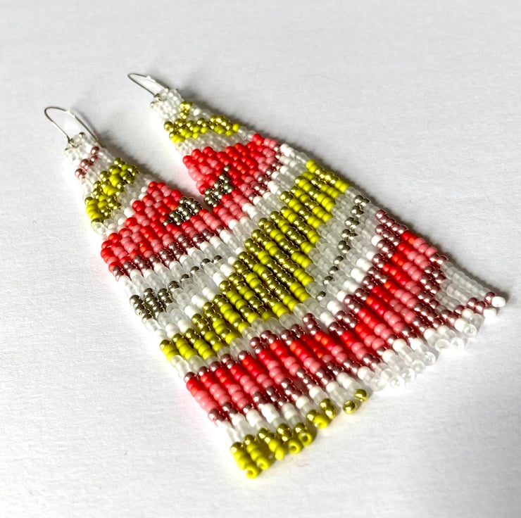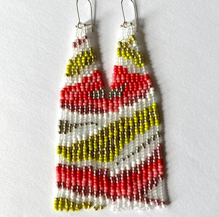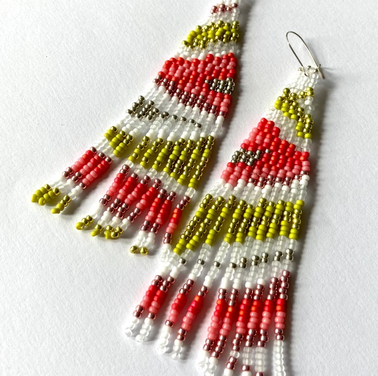These earrings are hand stitched using brick stitch and fringing beadweaving techniques to form a joyous eye-catching fringe below a triangular top. Each bead is individually picked up using a fine needle and specialist thread and either linked together and woven into a fabric like sheet to form the triangular top section (brick stitch) or picked up in long rows to make the long fringe. It's slow and painstaking work but the finished result is full of movement and life.