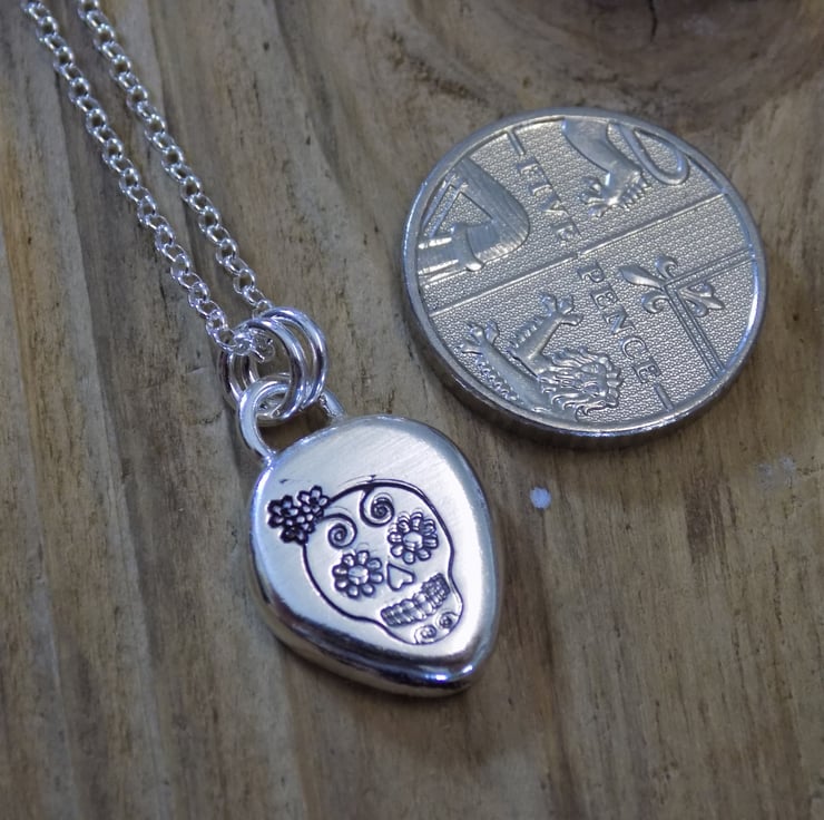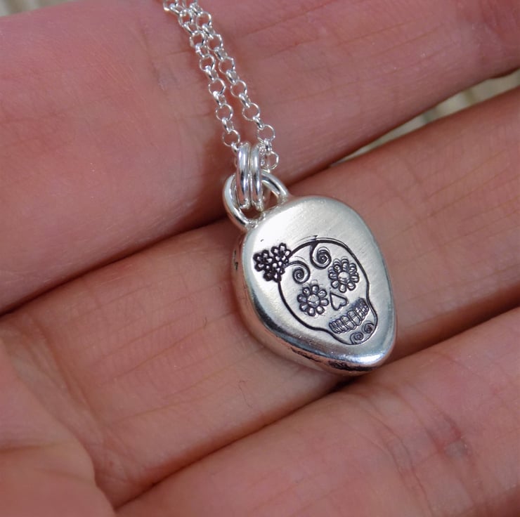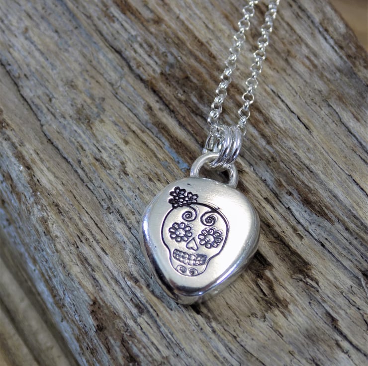Made from off cuts of sterling silver melted down, shaped, sanded and polished to a high shine. A sugar skull has been stamped on the front decorated with 3 tiny flowers. An 18 " sterling silver belcher chain hangs from a sturdy bail and two jump rings.