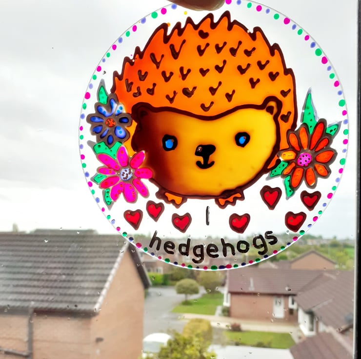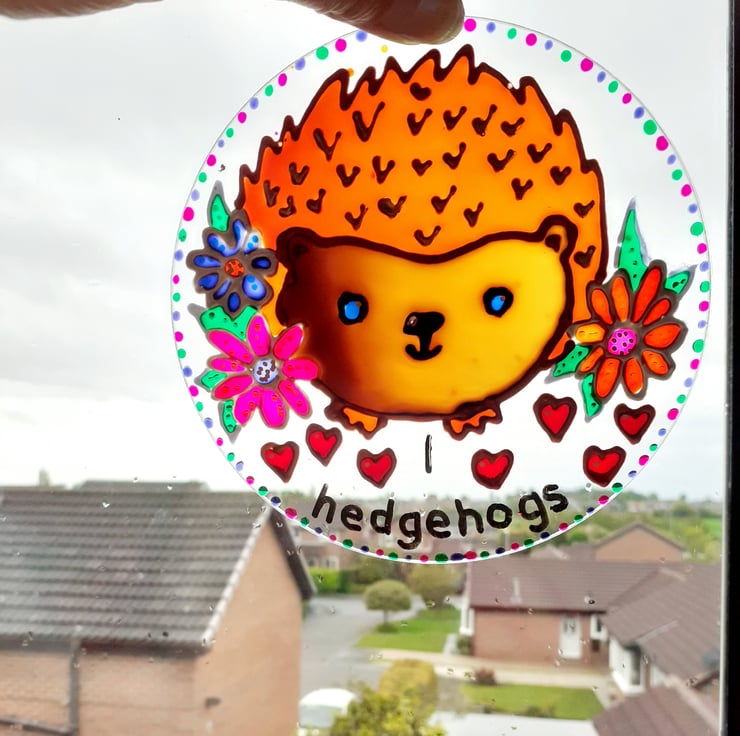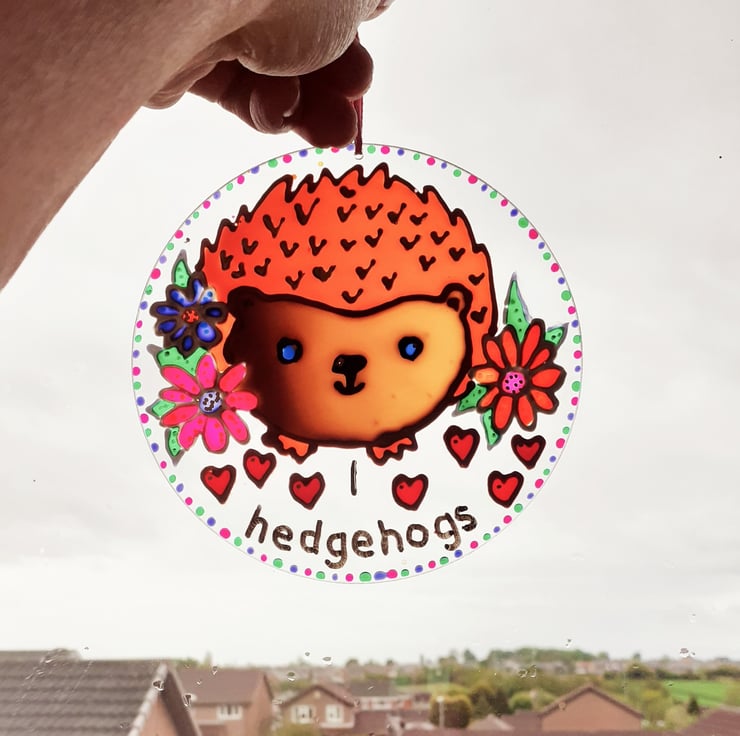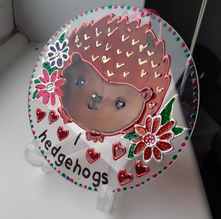 This is a hand painted glass sun catcher - the design has been drawn out using out-liners and then each section has been filled in with glass paints drop by drop. The glass paints are transparent and rich in colour and this is accentuated by the sun's rays. Just pop your hedgehog in your brightest window using the rubber sucker provided and the will lift your spirits every day.