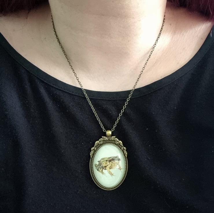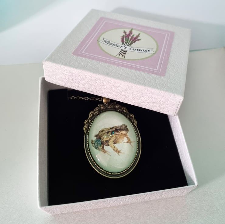 Antique bronze effect necklace with a frog illustration set in a cameo style pendant with decorative leaves. Necklace comes presented in a Heather's Cottage box.