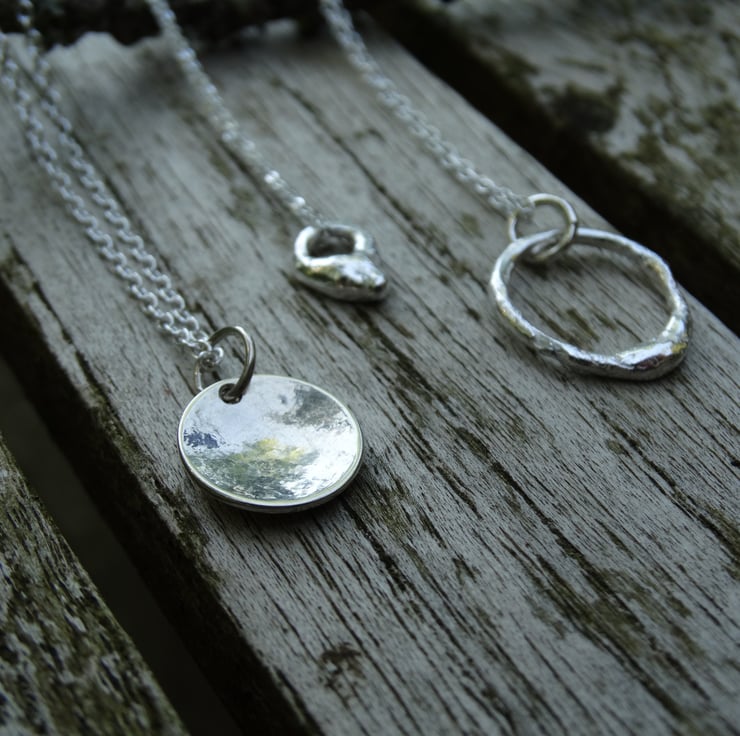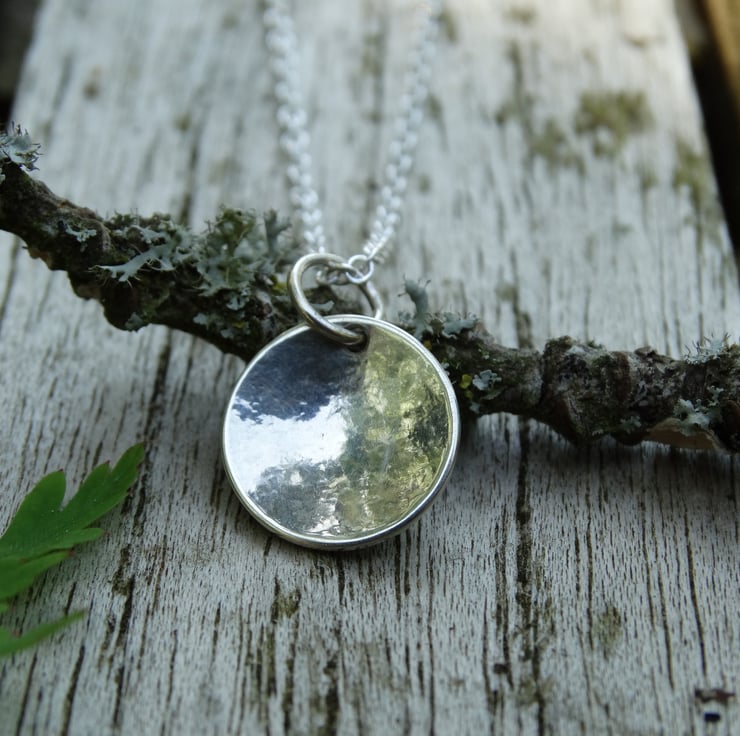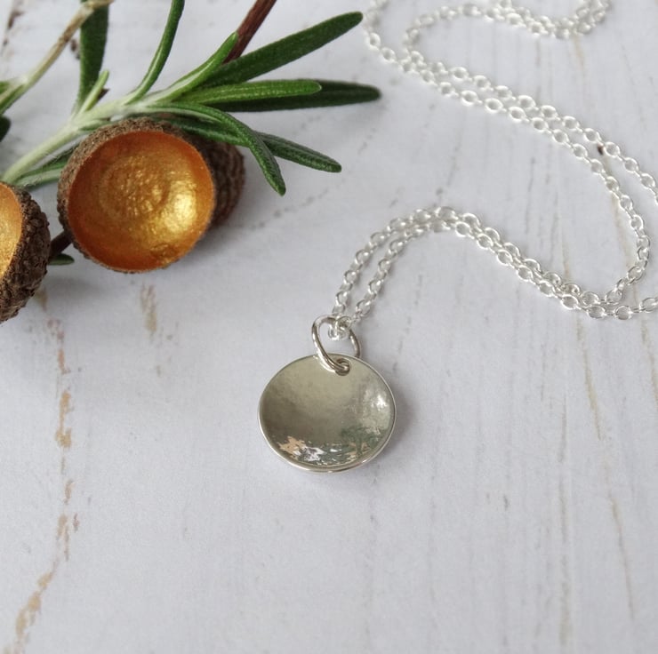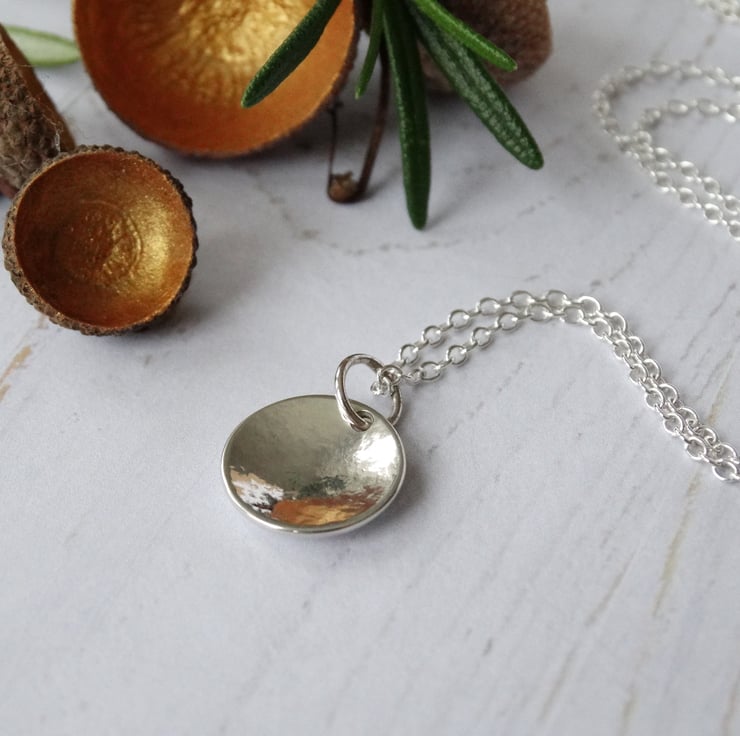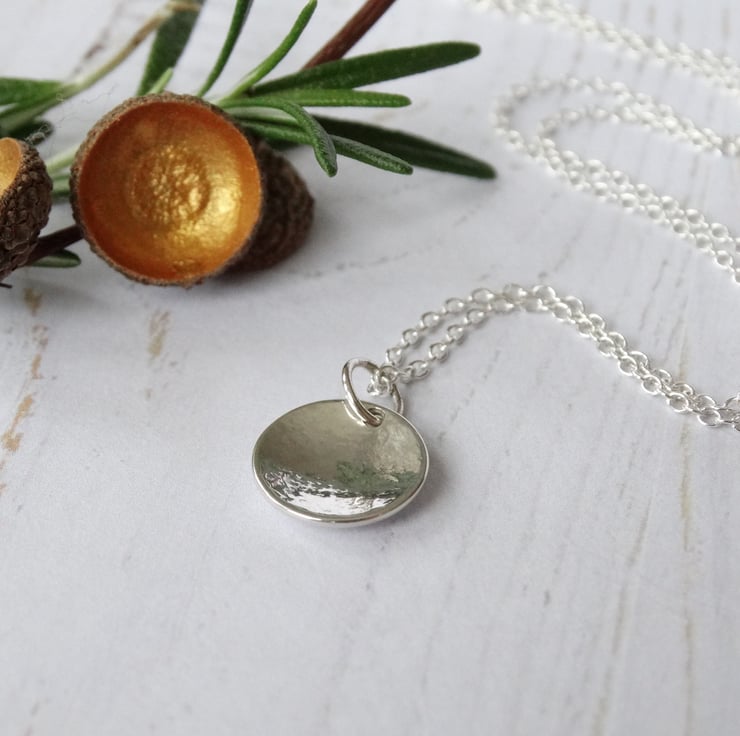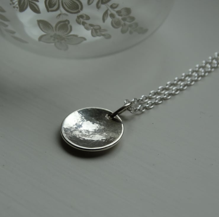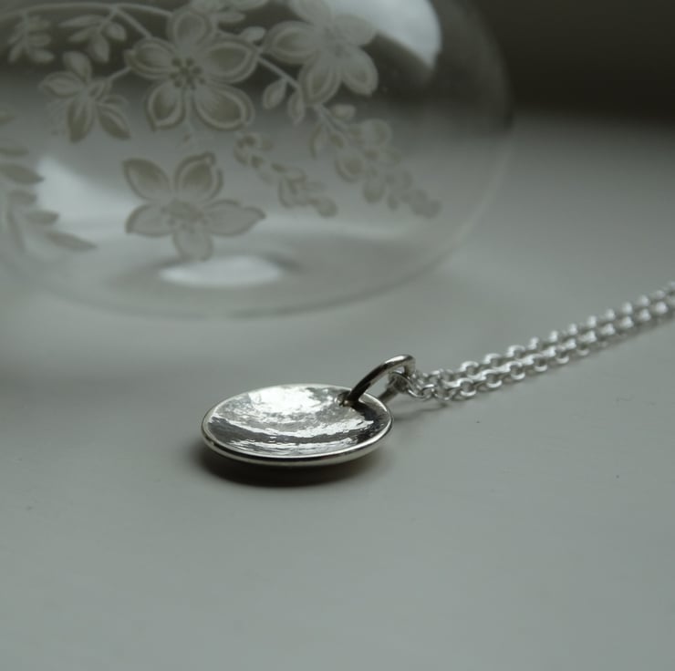 A pretty little pendant, handcrafted from recycled sterling silver (Eco Silver) which has been cut by hand into a little disc, textured, and formed into a gentle domed shape. It has been polished by hand which gives the silver a lovely glow rather than an overly bright shine.