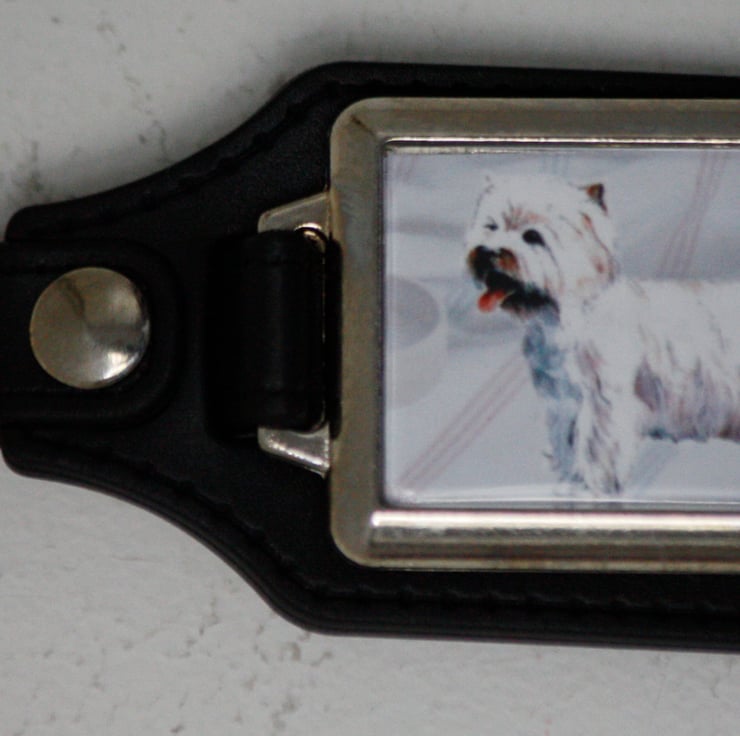 The Key Ring has a simulated leather fob and a silver plated medallion with an acrylic front cover over the illustration. It is 10 cm long (top of ring to bottom of fob) and 4 cm wide. The silver plated fob is 4.5 cm x 3.2 cm and the illustration is 4 cm x 2.5cm.