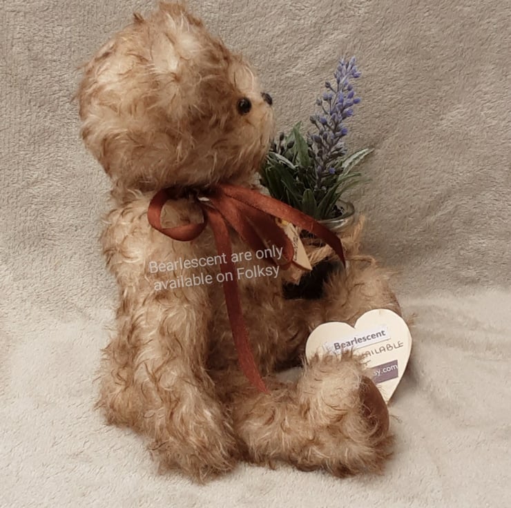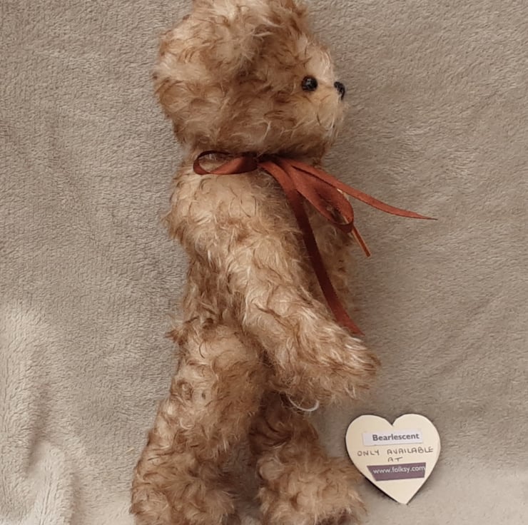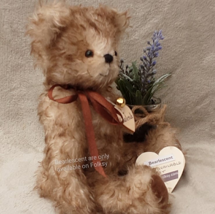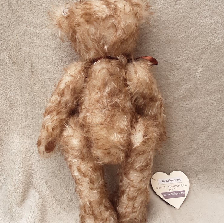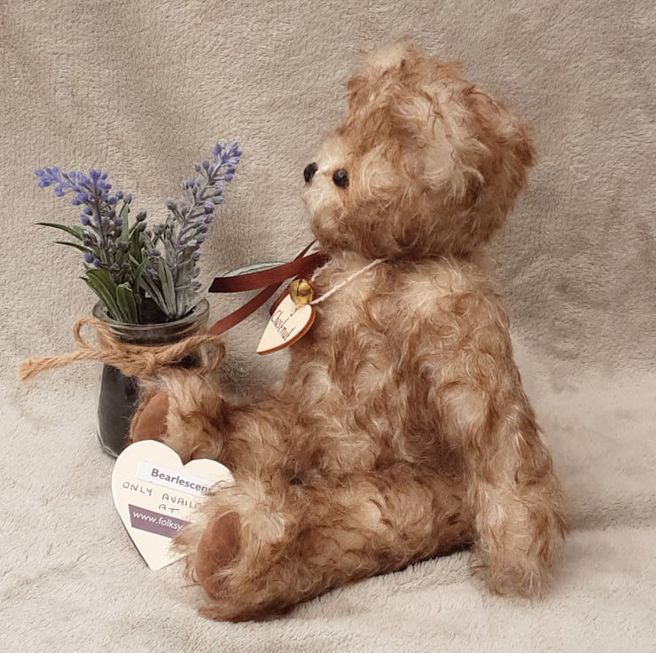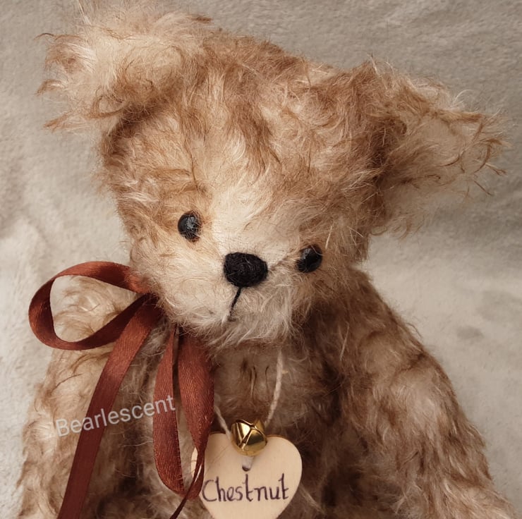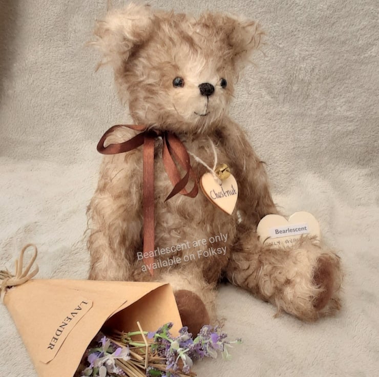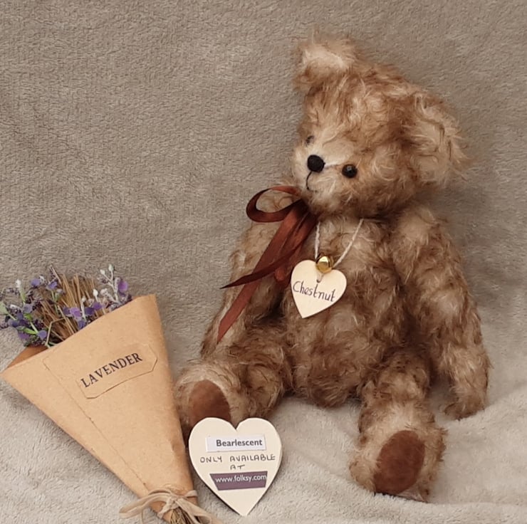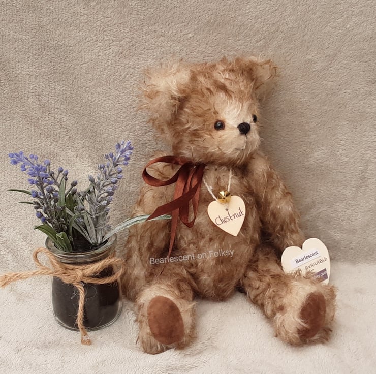 Chestnut wears his name on a wooden tag and Bearlescent is to the back of one ear on a polymer clay button. He is bear number 473 and will arrive with birth certificate.