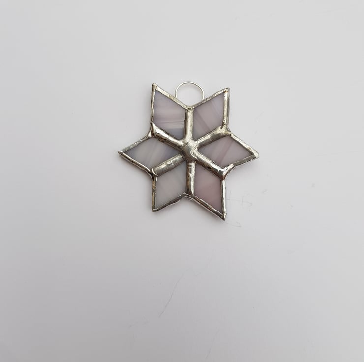 This small start is made using pale lilac glass and has a ring and invisible thread for hanging.