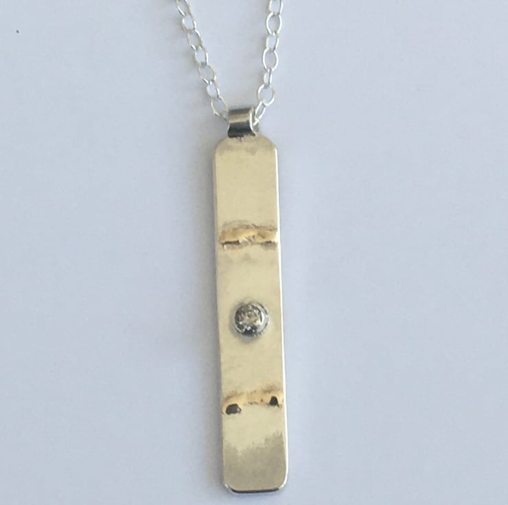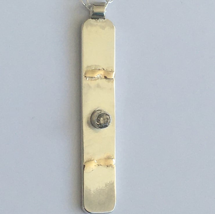 This elegant pendant is a simple Sterling silver bar with 9 carat gold fused to create organic pools of detail each pendant is totally unique. It has been set with a 2.5 mm salt and pepper diamond which has a lovely sparkle. This pendant has been designed for therapeutic qualities and as a tactile and wearable object for grounding.