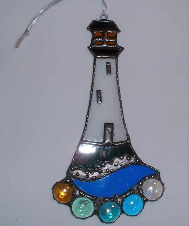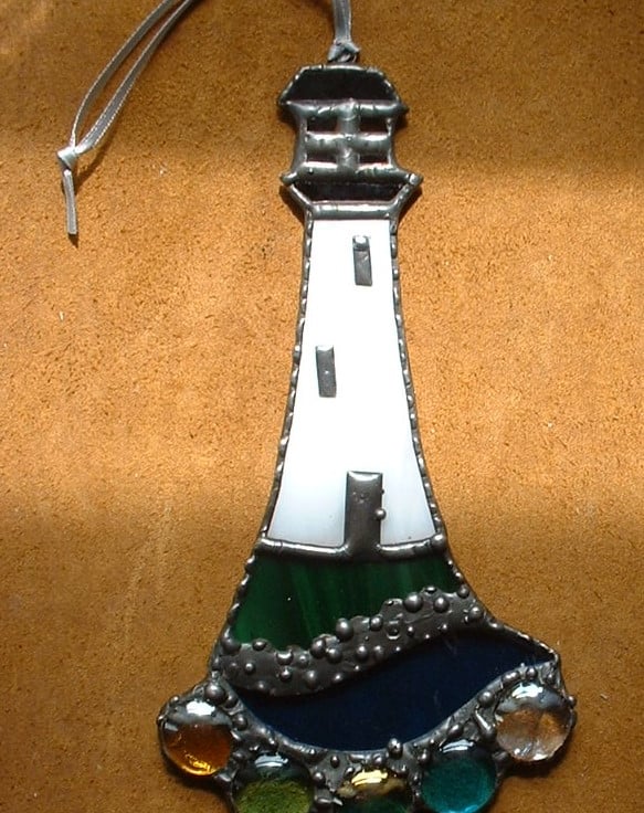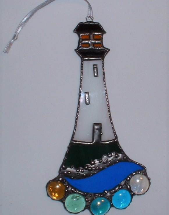 A beautiful unique design of a lighthouse with a wave of blue water and coloured glass globs. Made in the Tiffany Style each piece of glass has been hand cut and copper foiled before being soldered together. Decorative solder adds movement and detail and a silvery black patina applied and polished to shine. Hangs from a pale grey ribbon and copper hoop soldered in place.