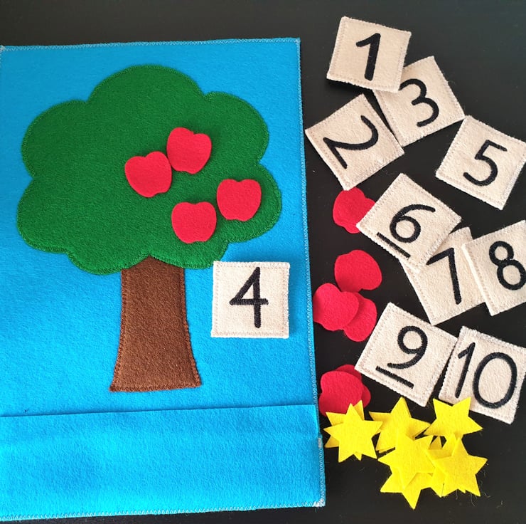 1 - Apple counting. Choose a number card and put the corresponding number of apples on the tree.