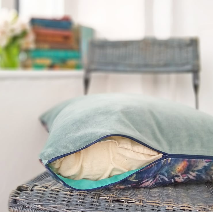 Fully-lined for durability, backed in grey-blue vintage velvet, with zip fastening and organic cotton filler, it would make a decorative addition to your home.