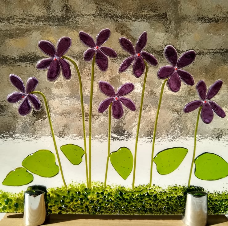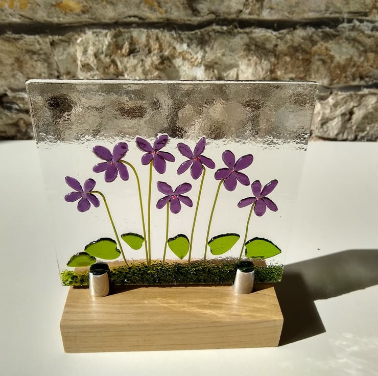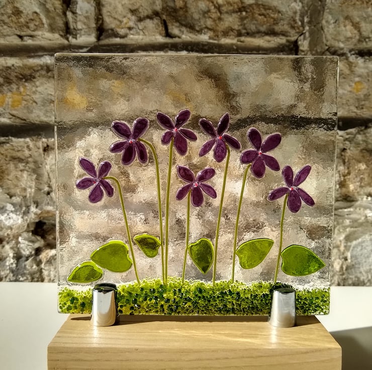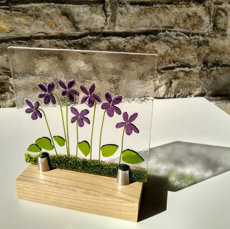 This made to order fused glass flower panel with a beautiful purple dog violet design adds a touch of spring to your home. As it stands on its own sycamore block you can display it wherever you can admire it best. Each petal and leaf is hand cut from sheet glass in such a way as to resemble this delicate spring flower as closely as possible. Extra detail on the centre of the flowers is achieved by using crushed glass.