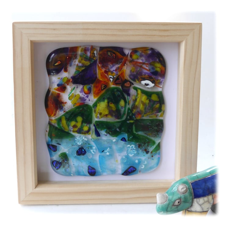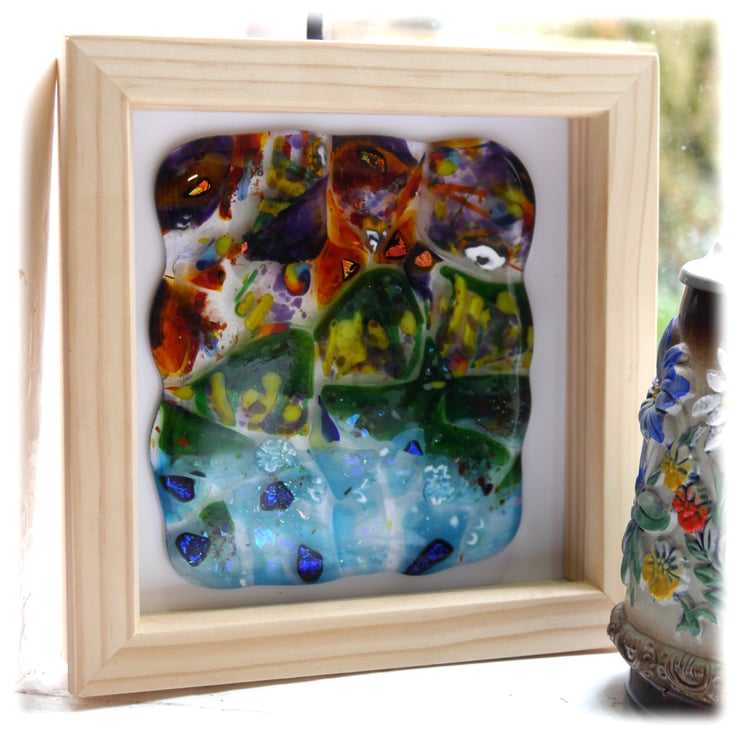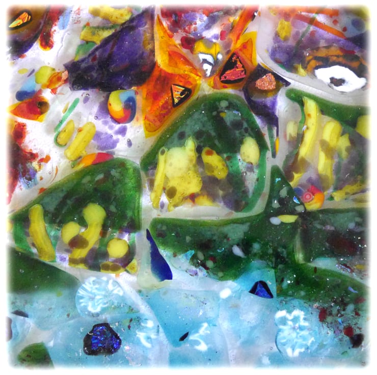 For this one I created a completely abstract picture using a base layer of clear glass which I then covered with a mix of patchworked pieces of vibrantly coloured fusing glass.