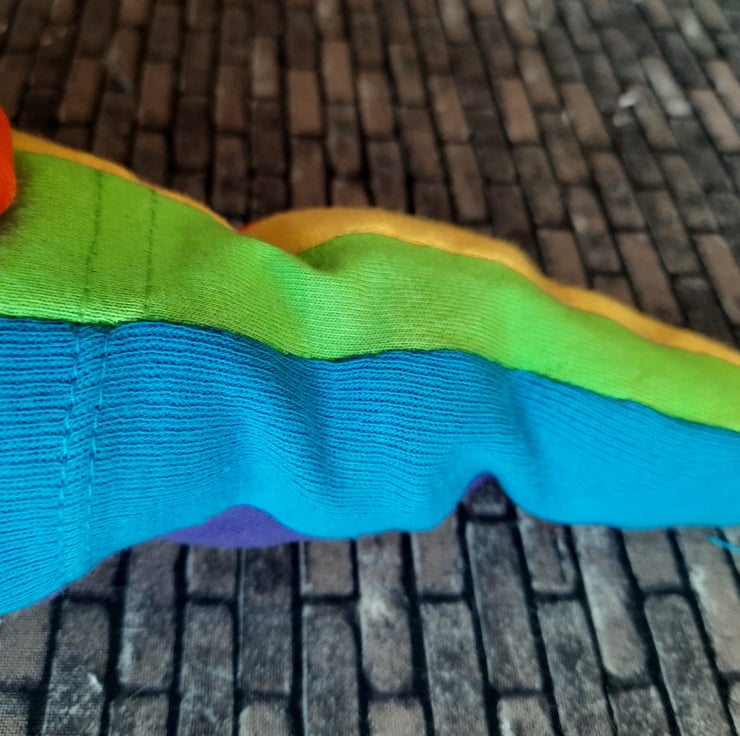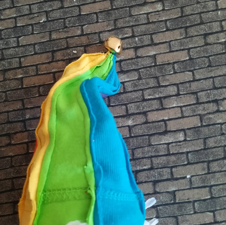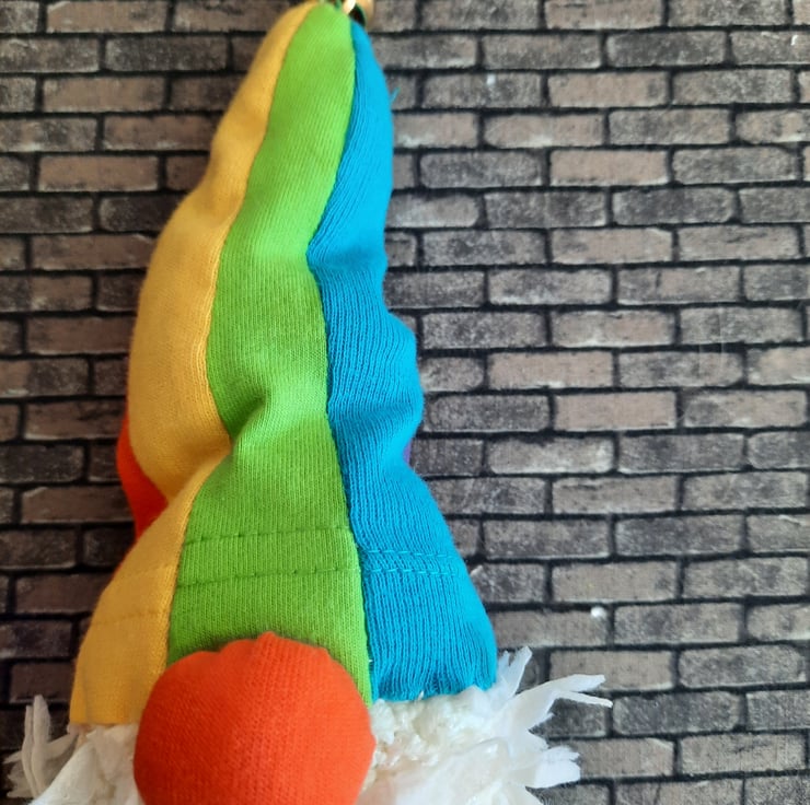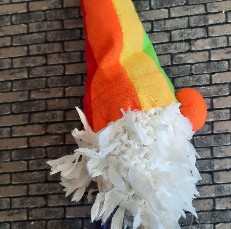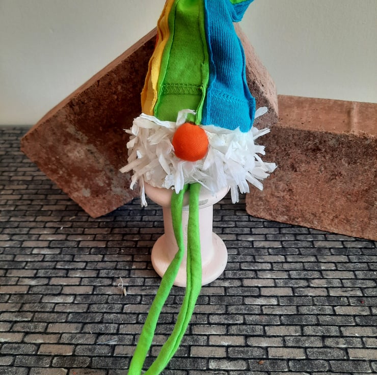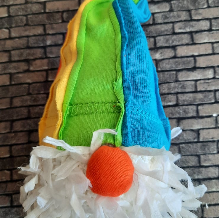 This charming, hand-stitched gnome is a truly one-of-a-kind creation, made with love from upcycled fabrics. The body and hat are crafted from repurposed T-shirts, while the nose is made from upcycled tights, giving each gnome a sustainable, eco-friendly touch.