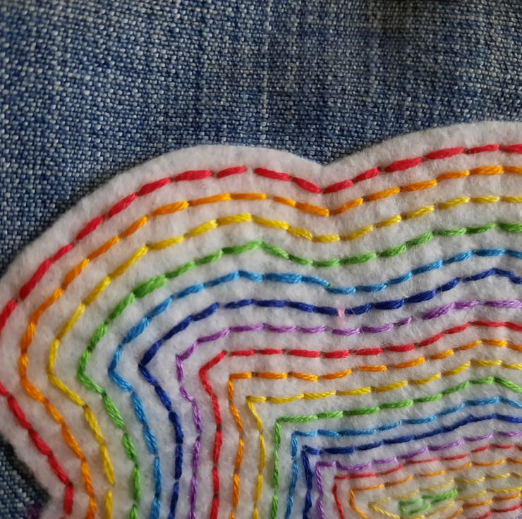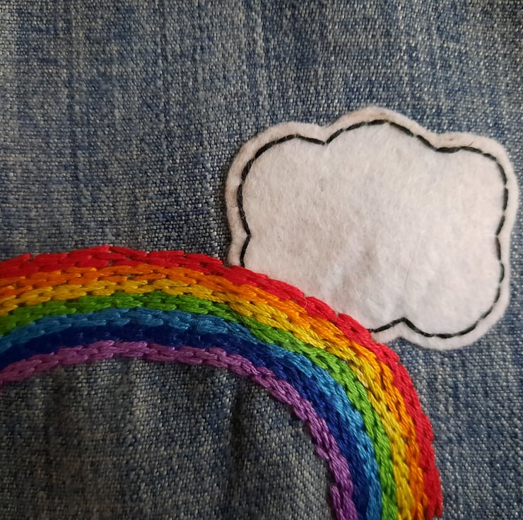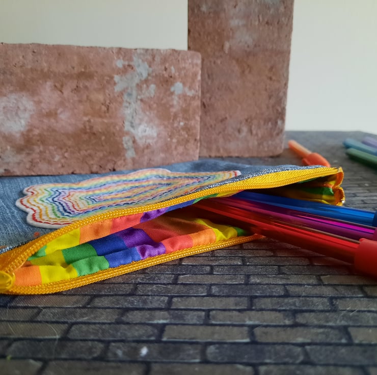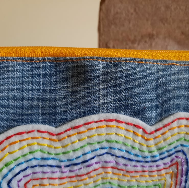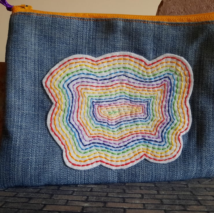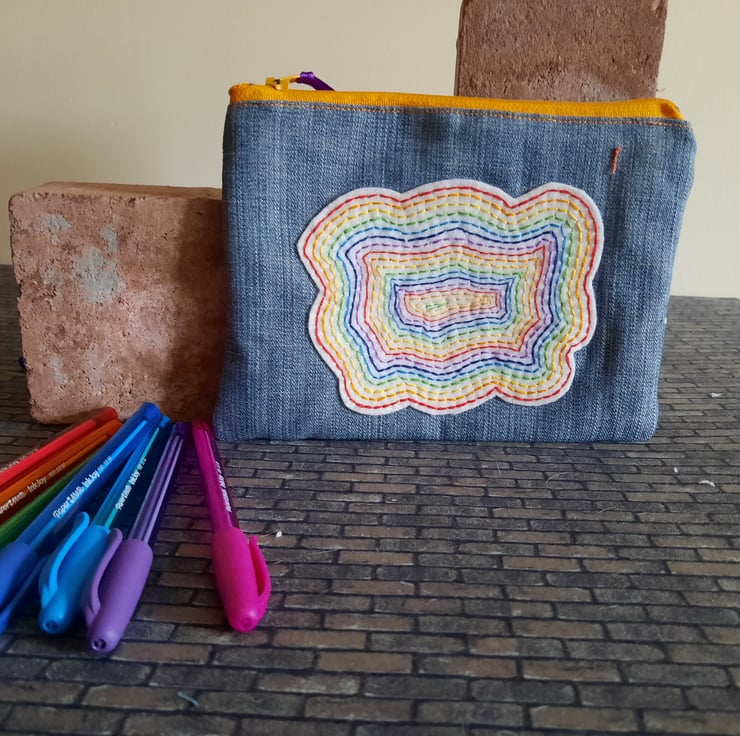 This versatile and beautifully handmade zippered pouch is perfect for storing pencils, makeup, or any little essentials! Crafted from repurposed denim jeans, each pouch is one of a kind, featuring hand-stitched applique and embroidery with a charming rainbow design on one side and a colourful design on the other.