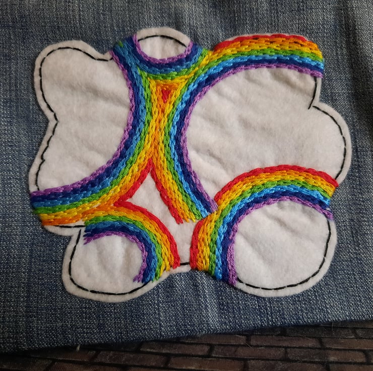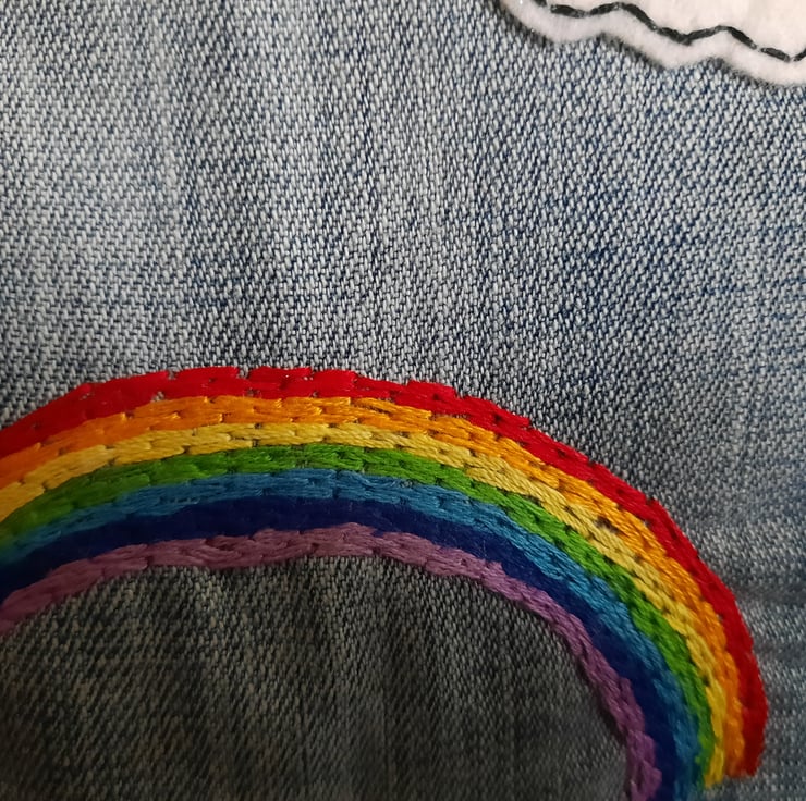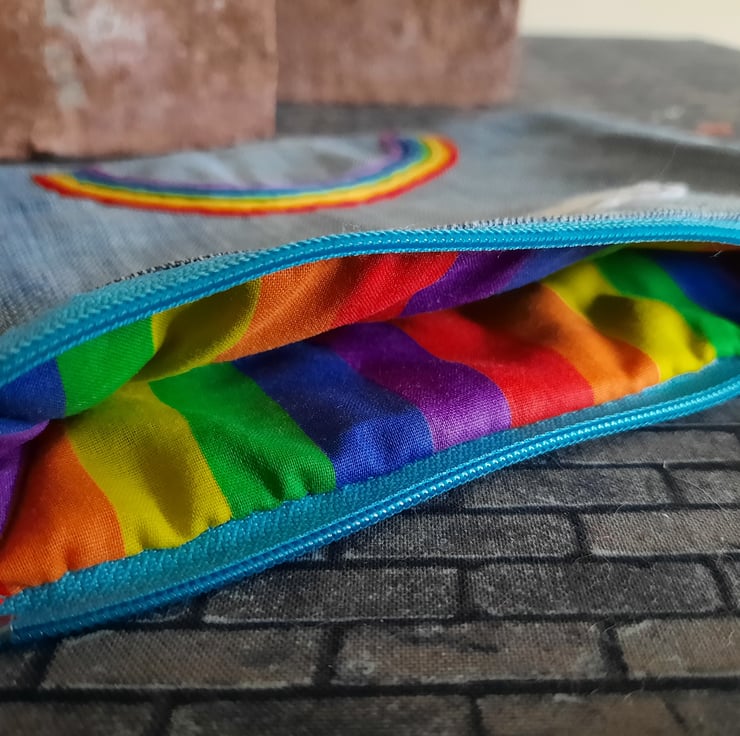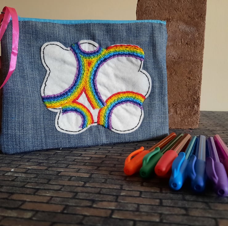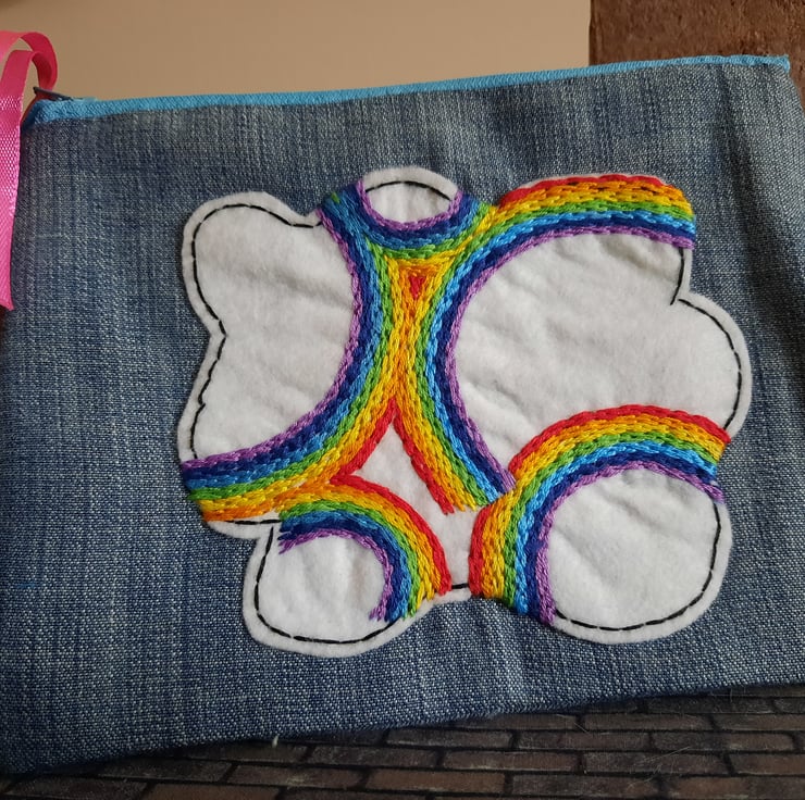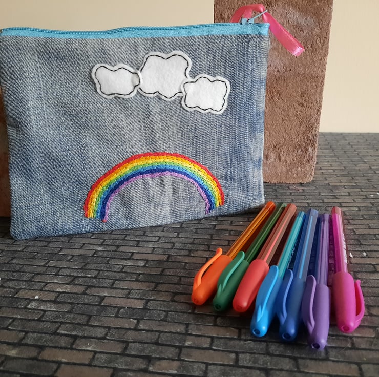 This versatile and beautifully handmade zippered pouch is perfect for storing pencils, makeup, or any little essentials! Crafted from repurposed denim jeans, each pouch is one of a kind, featuring hand-stitched applique and embroidery with a charming rainbow design on one side and a colourful design on the other.