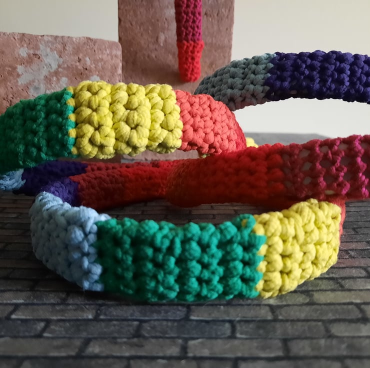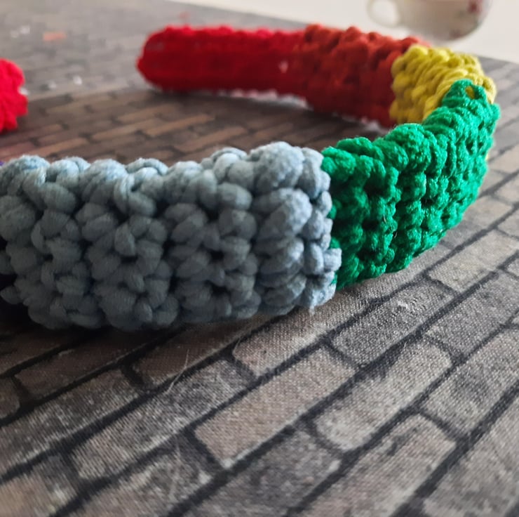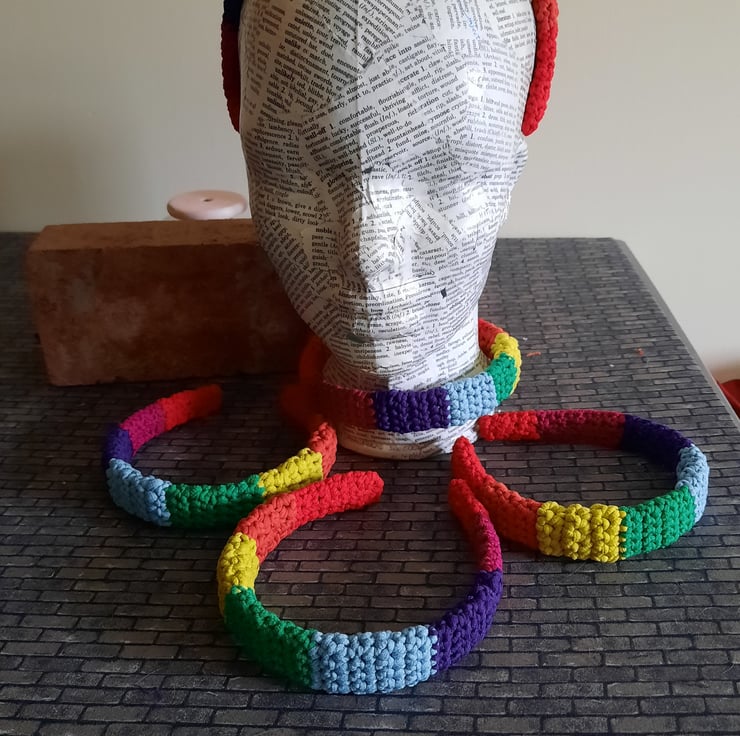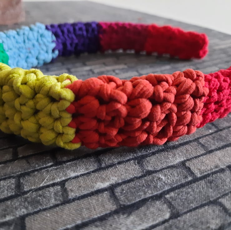 Brighten up your hairstyle with a unique and eco-friendly touch! These handmade crocheted rainbow headbands are crafted with care from upcycled yarn, created by repurposing colorful tights. Each headband is not only a statement piece but also a sustainable choice. The vibrant crocheted design is securely atached to a sturdy plastic Alice band, ensuring it stays comfortably in place. Designed to fit both children and adults, these headbands combine style, creativity, and sustainability for a standout accessory that’s as kind to the planet as it is to your look.