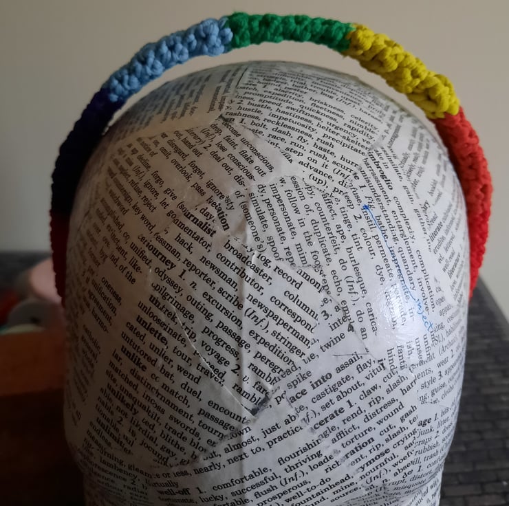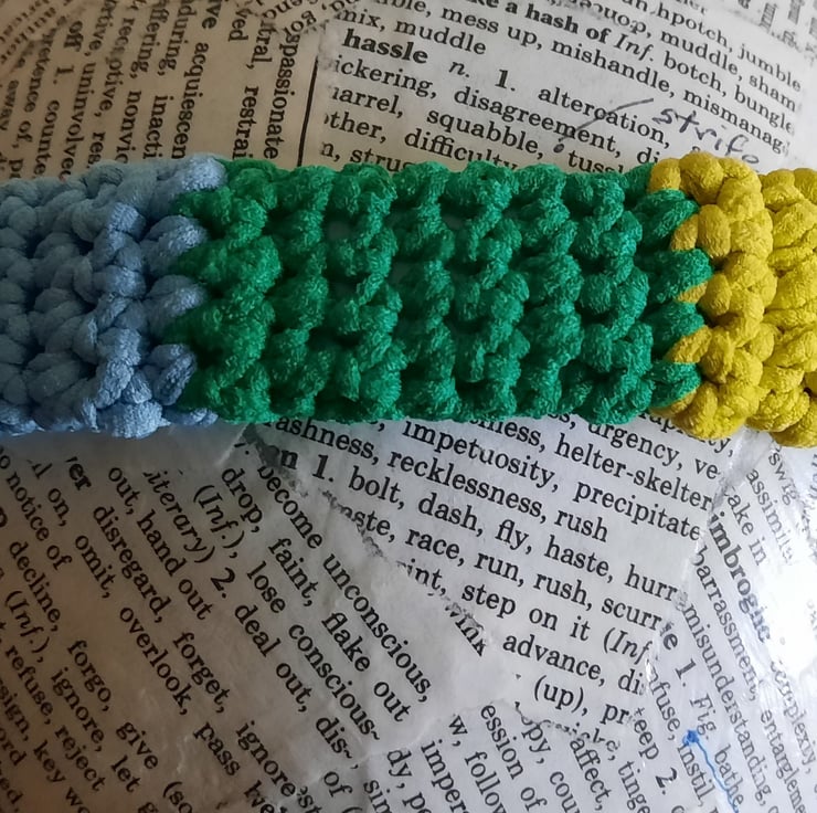 Givie can crochet, Lane is known for wearing colourful tights, the Givielane stash contains plastic hairbands from long ago. How do you upcycle the tights - turn them into yarn and crochet them into a cover transforming boring white plastic hairbands.