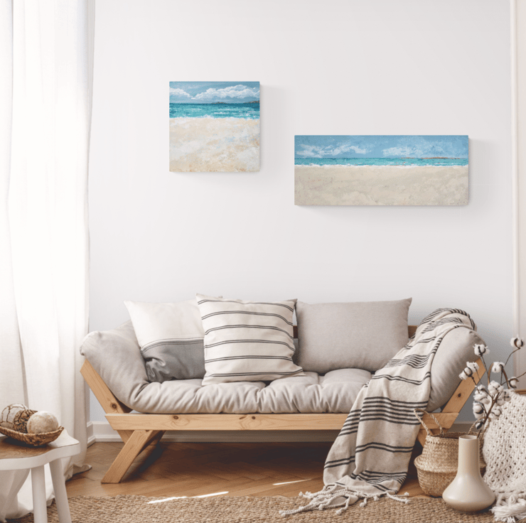 I’ve used acrylic paint thickened with texture paste to give depth to my imagined Cornish beach scene. It’s so tempting to add a couple of gulls, a dog, boats or people into the mix when you’re painting a beach scene but I’ve resisted because in this painting ‘Fresh Breeze’ I just wanted to focus on the sensual elements - the colours of sand, the salty sea-spray and the nip in the air despite the sun trying to come through.