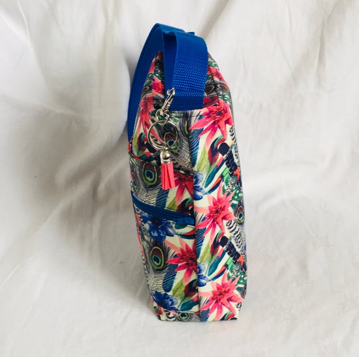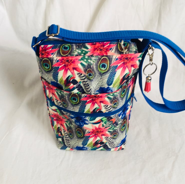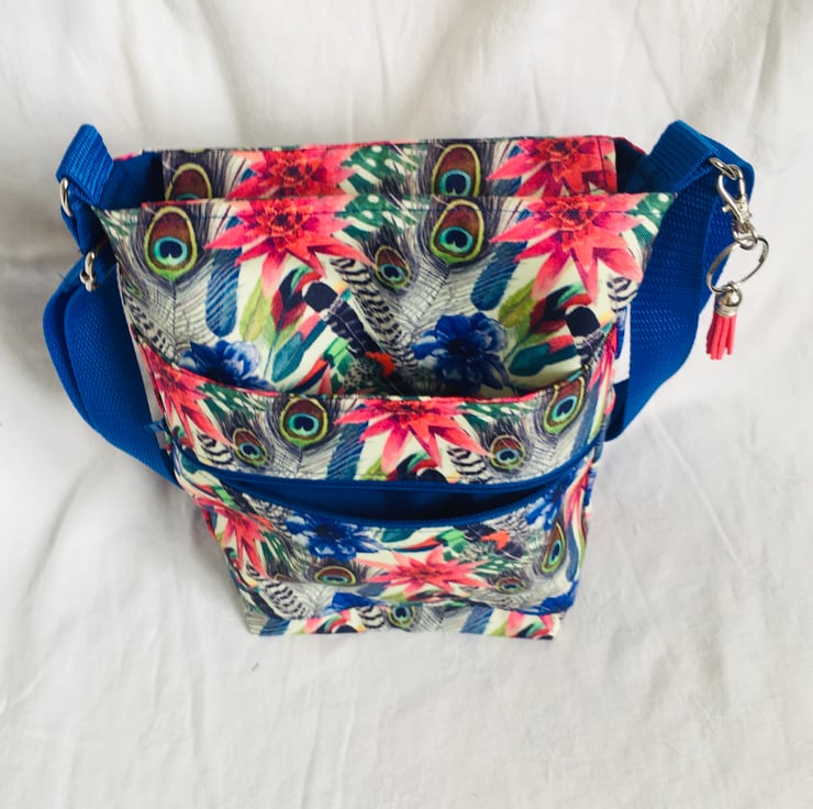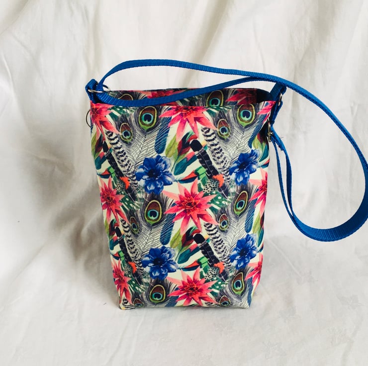 The bag has been made with high quality water resistant fabric, with Feather and Leaf print on Cream background, fully lined in a plain cotton fabric and finished with a fully adjustable nylon woven strap. The bag not only has a nice large main compartment, it also has 2 additional pockets on the front, a secure zip pocket and a slip pocket, across the width of the bag.