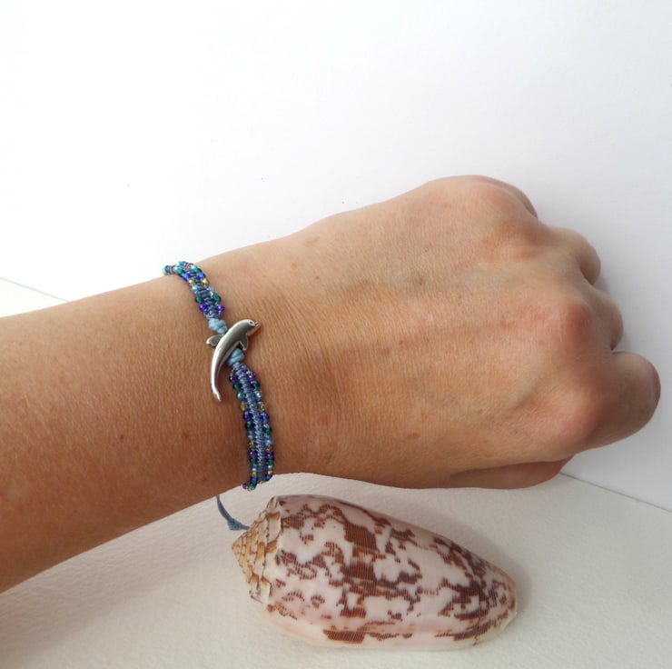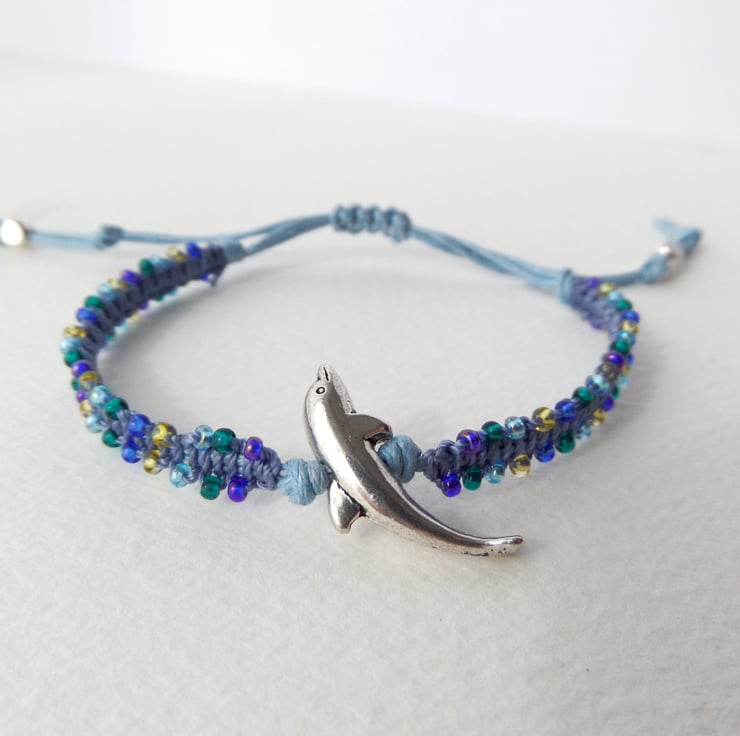 A lovely sleek silver dolphin is the inspiration for the colours of beads, all sea greens and blues, on a light blue cotton bracelet.