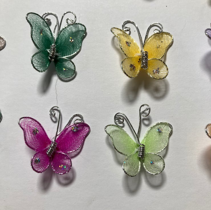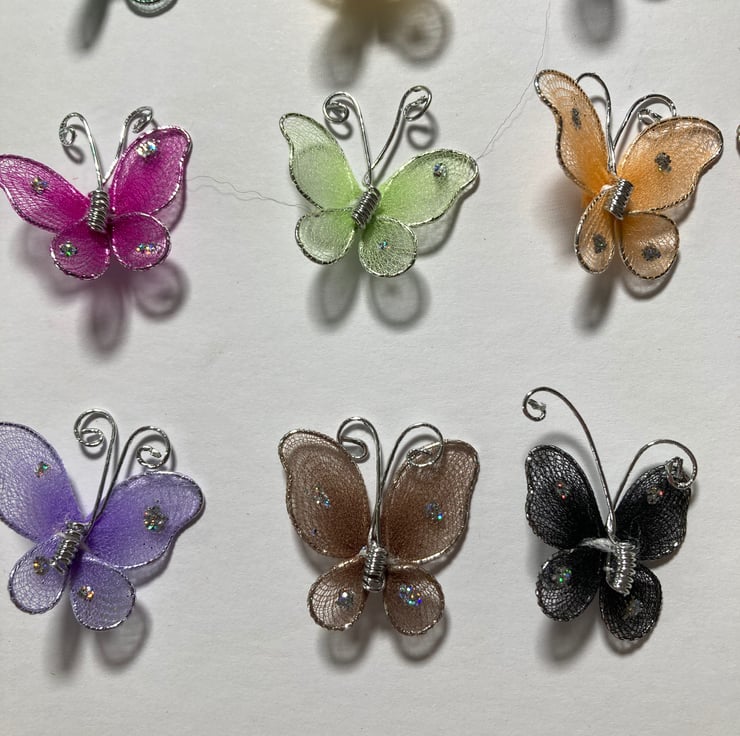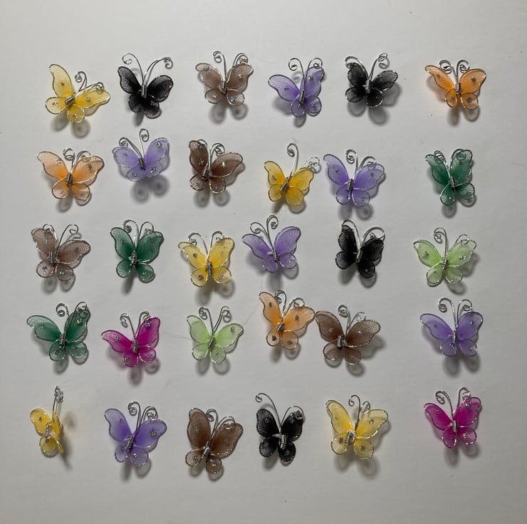 This listing is for a pack of 30 butterflies. These beautiful butterfly embellishments are made from organza on a silver coloured wire frame. They come in a large array of colours. They measure approximately 20mm x 30mm and are a fabulous embellishment on cards or any other craft project.