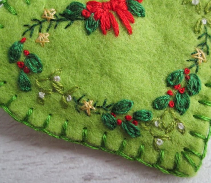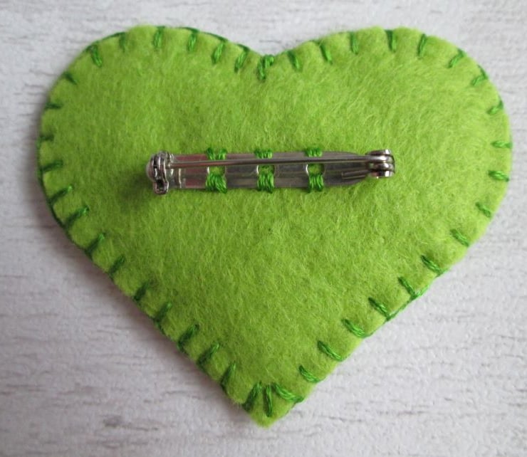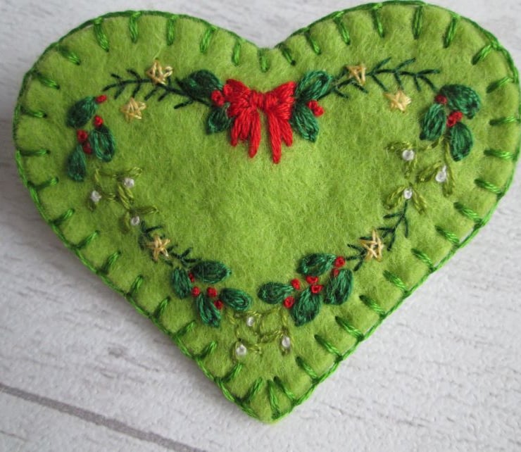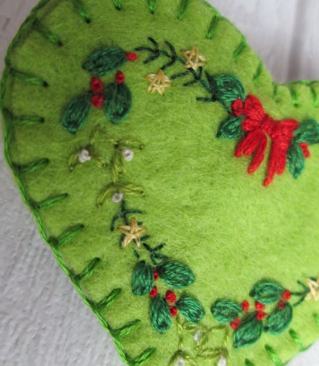 This little wool felt heart is in a shade of green called 'caterpillar' which I simply love. I've hand embroidered it with a heart shaped garland of holly, pine and mistletoe for the festive season, added tiny gold stars to the pine branches and topped it off with cheery red bow. Measuring just 7 cm wide by 6 cm high the brooch is finished with green blanket stitch and fitted with a metal brooch fastening.