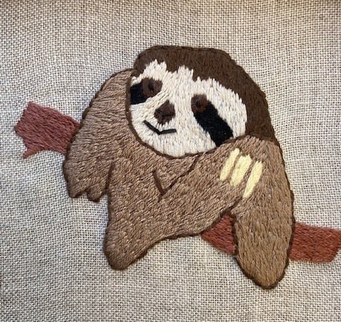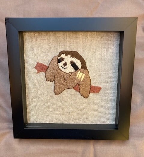 This cool sloth is hanging on his tree, probably listening to jazz! He has been hand embroidered onto a light natural canvas and framed in a black box frame 17.5cm x 17.5 cm (7" x 7"). The picture has a picture frame stand attached on the back or you can hang it on the wall.