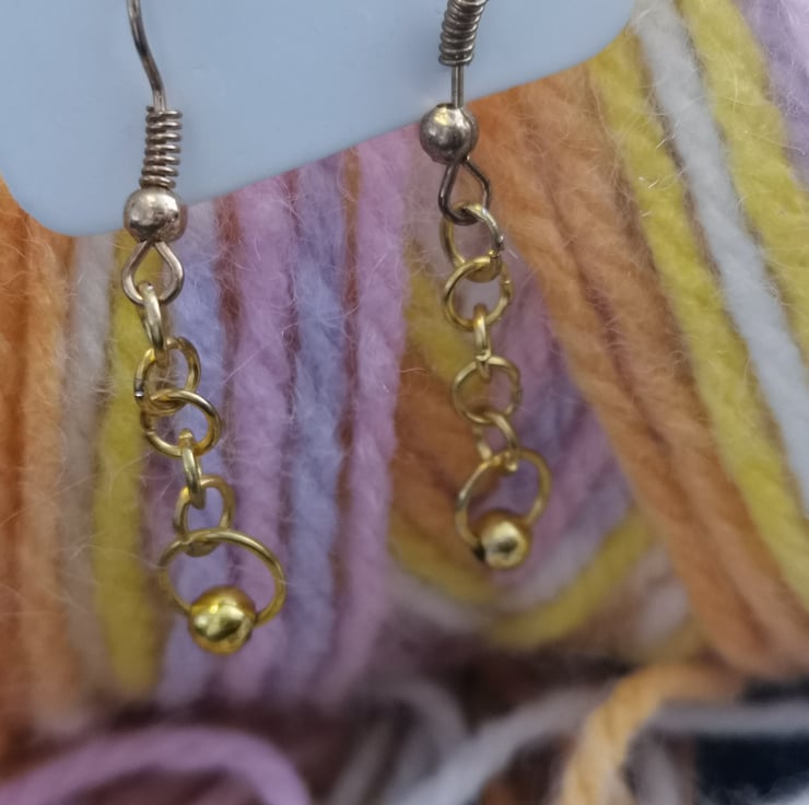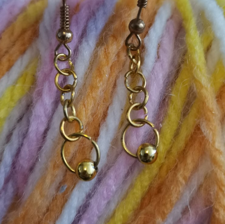 I made these earrings linking golden jump rings together to form a chain then finished it off with a golden bead on a bigger jump ring