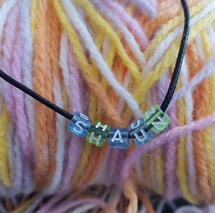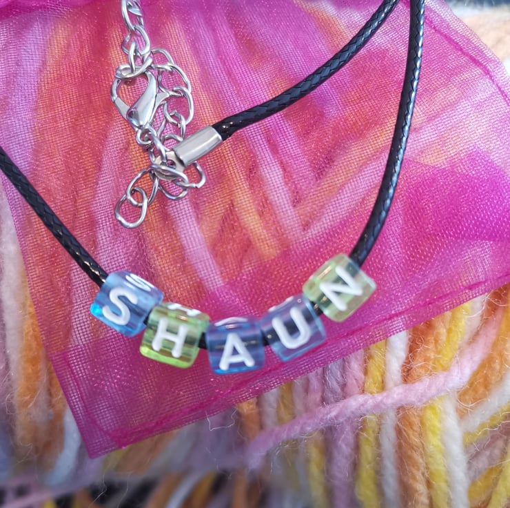 I have made lots of name necklaces with all different coloured beads and letters, this special necklace is shaun in see through beads and white letters, they are green and blue beads on a wax cord finished with extra chain for exstenion and a lobster clasp