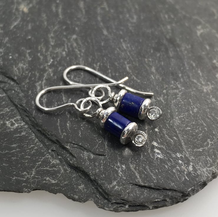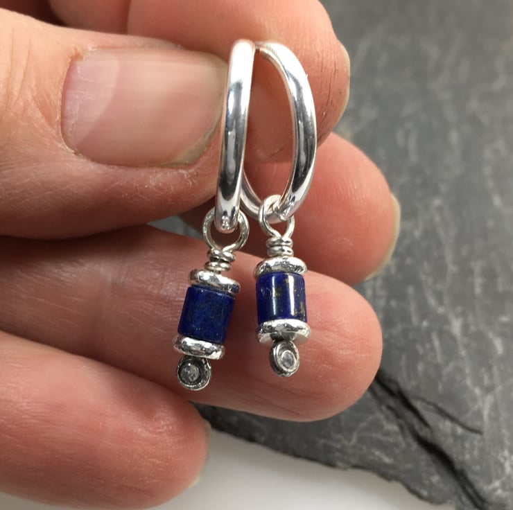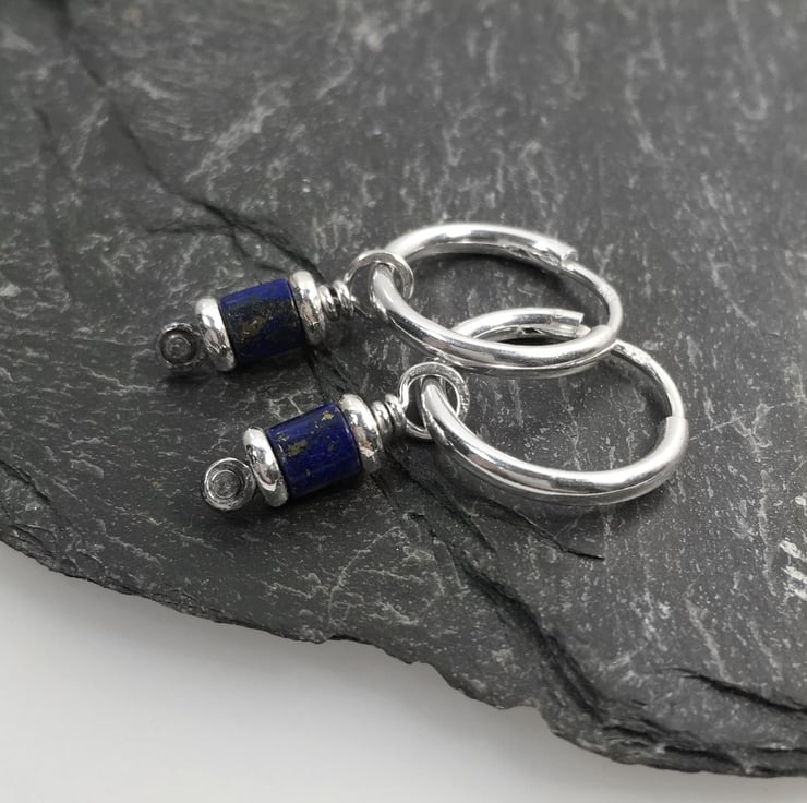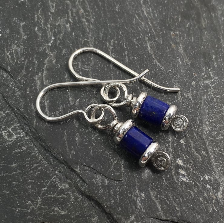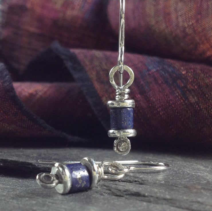 Forged sterling silver pins have been threaded through small silver washer beads and dark blue lapis heishi.